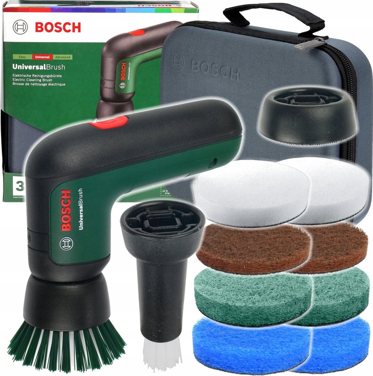 Die Bosch UniversalBrush wurde für vielfältige Einsatzmöglichkeiten entwickelt. Im Lieferumfang sind verschiedene Reinigungspads enthalten, darunter Heavy-Duty-, Mikrofaser-, Melamin- und Küchenpads, sodass das Gerät an die jeweilige Aufgabe angepasst werden kann. Darüber hinaus ermöglichen die breiten und präzisen Bürsten das Erreichen schwer zugänglicher Stellen, was sie zur idealen Lösung für eine umfassende Reinigung macht.