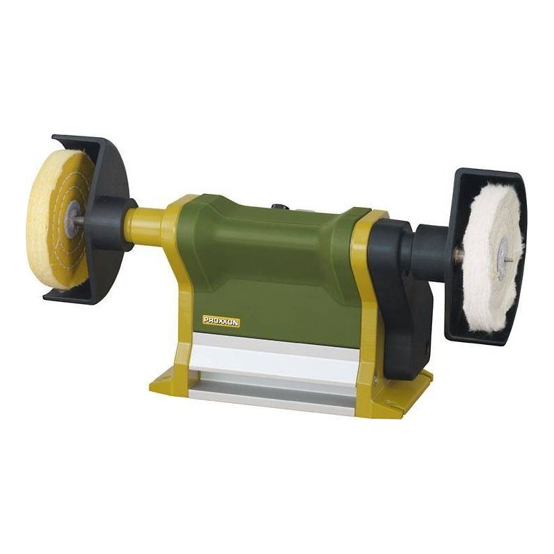 - Ausgestattet mit einer langen, gelagerten Welle (Abstand zu den Scheiben ca. 360 mm) sowie Schutzhüllen, die ein sauberes Arbeiten mit Polierpasten ermöglichen.