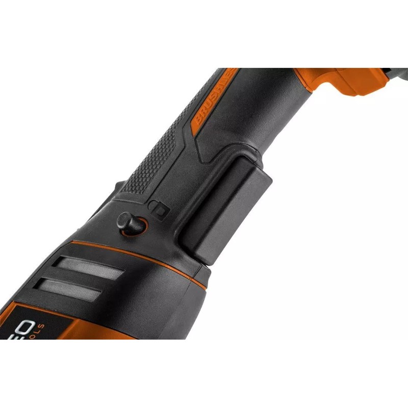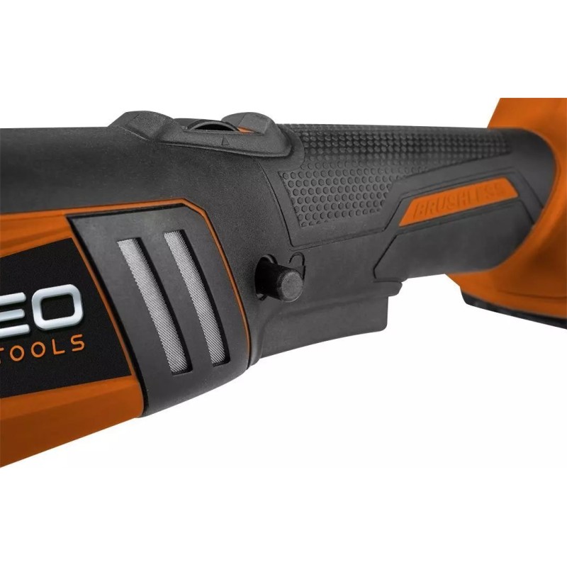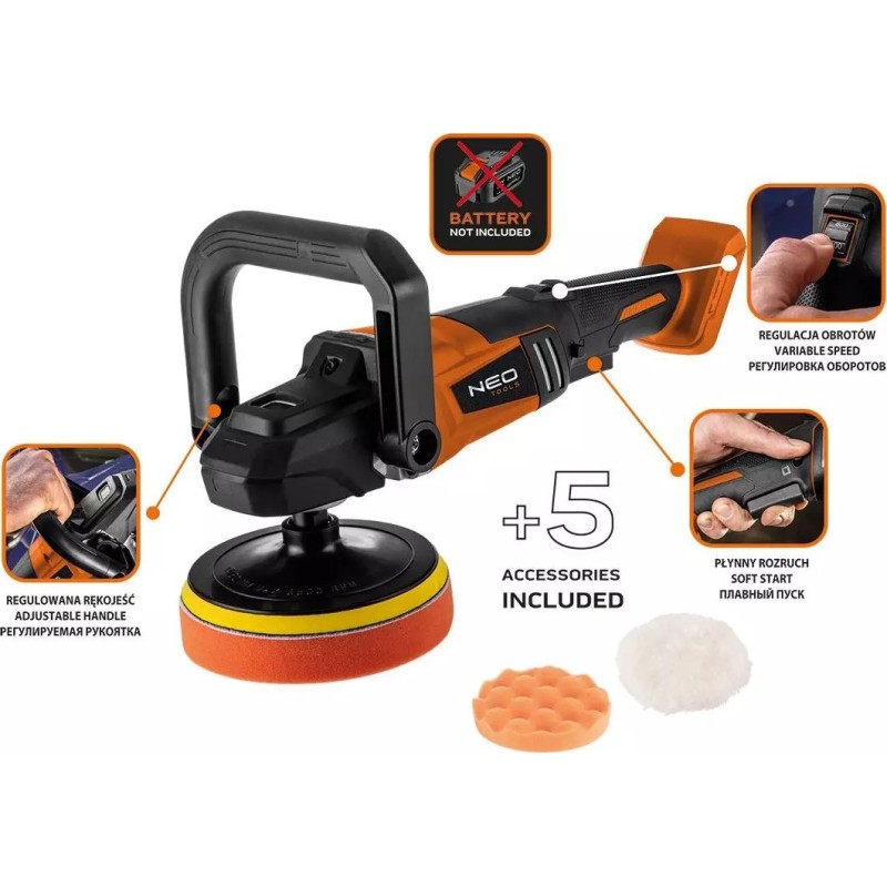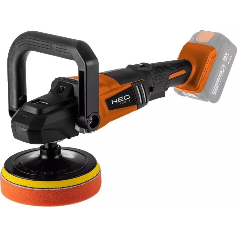 Poliermaschine mit leistungsstarkem bürstenlosem Motor der Marke NEO, Teil der Serie moderner Akku-Werkzeuge Energy+. Das Gerät ist kompatibel mit einem 18-V-Lithium-Ionen-Akku der Marke GRAPHITE.