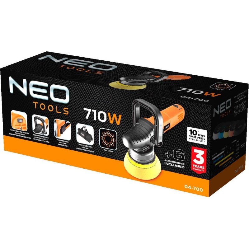 Orbitalpoliermaschine der Marke NEO mit einer Motorleistung von 710 W. Dieses praktische Werkzeug aus langlebigen Materialien ist für viele Jahre komfortablen Einsatz ausgelegt. Ausgestattet mit einer stufenlosen Drehzahlregelung von 2000 bis 4600 Umdrehungen pro Minute und einer Scheibe mit einem Durchmesser von 125 mm. Dank des im Lieferumfang enthaltenen Polierschwamms lässt sich die Polierpaste bequem auftragen und die Arbeiten schnell und effektiv ausführen.
