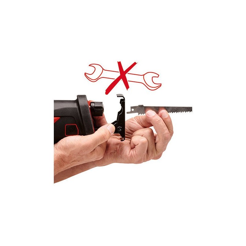 Um das Sägeblatt, das jederzeit werkzeuglos gewechselt werden kann, optimal zu nutzen, ist die Akku-Universalsäge mit einem werkzeuglos verstellbaren Fuß ausgestattet. Der vordere Teil der Säge ist zudem staubdicht, um Motor und Getriebe zu schützen.