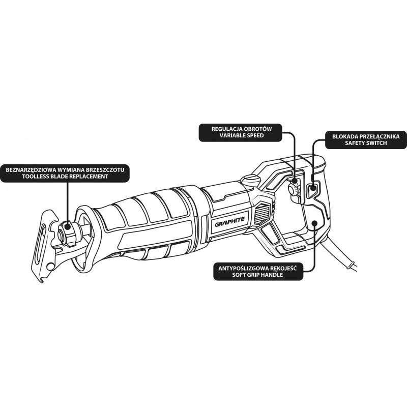 Eine vielseitige Säbelsäge der Marke GRAPHITE, die das Arbeiten an schwer zugänglichen Stellen ermöglicht. Sie verfügt über eine Leistung von 710 W. Sie wird in einem praktischen Set mit Sägeblättern für Holz und Metall angeboten. Das Gerät erreicht eine Drehzahl von bis zu 2800 Umdrehungen pro Minute. Der Sägehub beträgt 20 mm, die Schnitttiefe (je nach montiertem Sägeblatt) 115 mm bei Holz und 8 mm bei Stahl.