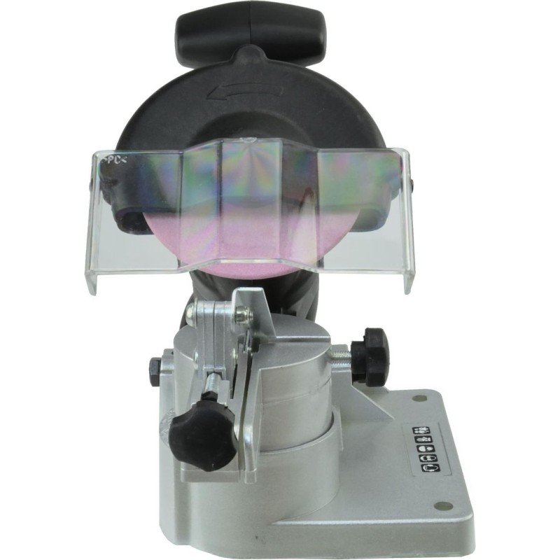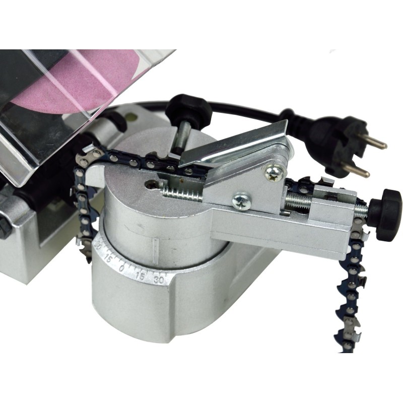 Elektrischer Kettenschärfer 220 W Der Schärfer ist zum Schleifen und Schärfen von Ketten für Elektro- und Benzinkettensägen bestimmt. Mit einer Leistung von 220 W und einer Drehzahl von 7500 U/min lässt sich das gewünschte Ergebnis schnell erzielen. Das Gerät verfügt über einen integrierten Spanner, der in Verbindung mit einer gut lesbaren Schleifskala für ein sehr präzises Schleifen sorgt. Produktmerkmale: Befestigung auf der Arbeitsplatte mittels Schrauben zum Schärfen von Ketten verschiedener Typen und Marken, austauschbare Schleifscheibe, integrierter Schleiftiefenanschlag, Spanner und Kettenschärfskala, Möglichkeit, den Schraubstock um 35° nach rechts/links zu drehen. Technische Daten: Nennspannung: 230 V~50 Hz Leistung: 220 W Drehzahl: 7500 U/min Abmessungen der Schleifscheibe: 100 x 10 x 3,2 mm