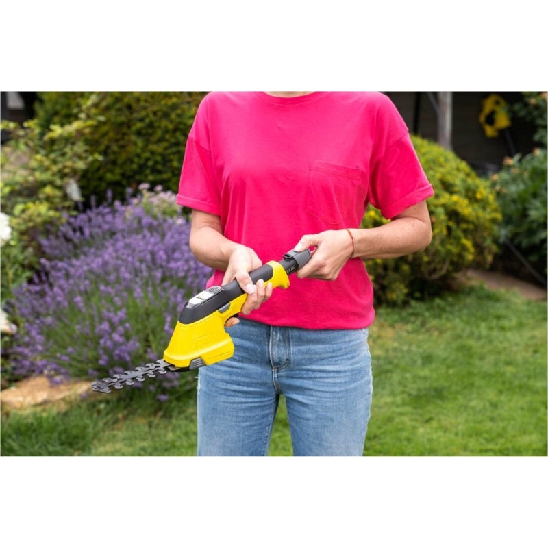 Die Grasschere KARCHER GSH 4-4 Plus 1.445-320.0 verfügt über ein scharfes und robustes 8 cm breites Grasklingenblatt sowie ein Strauchschneideblatt mit einer Schnittlänge von 11 cm, die für präzise Schnitte und ein glattes Finish sorgen.