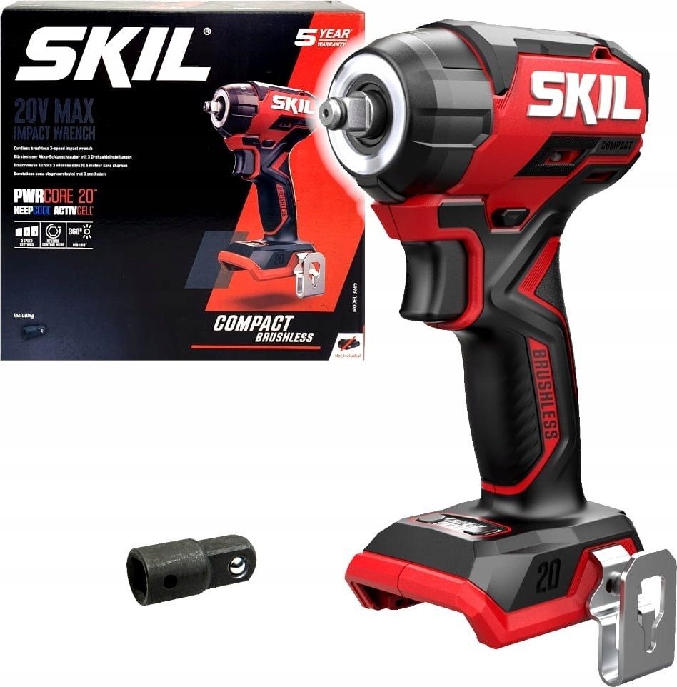 Im Lieferumfang enthalten sind der bürstenlose Schlagschrauber SKIL 3265, ein 3/8"-Sechskantadapter auf 1/2", eine Metall-Gürtelschlaufe sowie eine Bedienungsanleitung. Bitte beachten Sie jedoch, dass Akku und Ladegerät nicht zum Standardlieferumfang gehören.