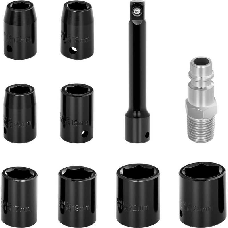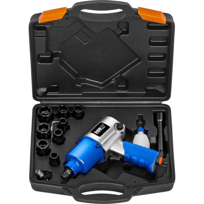 Das Gerät erreicht eine Drehzahl von bis zu 8000 U/min und ein Drehmoment von 700 Nm. Der Leistungsregler (3 Drehzahlen zum Anziehen, 1 zum Lösen) mit Vor-/Rückwärts-Einstellung ermöglicht die Anpassung der Drehzahl an die jeweilige Aufgabe. Mit dem Umschalter für Links- und Rechtslauf kann der Montage- oder Demontagemodus gewählt werden. Der Twin-Hammer-Schlagmechanismus sorgt für eine enorme Reißkraft, die bei größeren Fahrzeugen oder festsitzenden Schrauben nützlich ist. Der vordere Luftauslass sowie der ergonomische, rutschfeste und vibrationsdämpfende Griff ermöglichen komfortables Arbeiten. Ein umfangreiches Zubehörset bestehend aus Steckschlüsseln in verschiedenen Größen (12, 13, 14, 15, 17, 19, 22, 24 mm), einem 1/4"-Anschluss, einem Inbusschlüssel, einer Verlängerung und einer Ölflasche rundet die Ausstattung des Druckluftschraubers ab. Der Koffer schützt das gesamte Zubehör vor Beschädigungen.