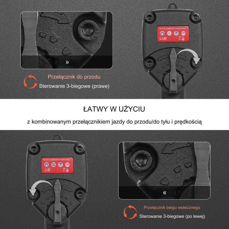 Dieser 3/8-Zoll-Schlagschrauber (9,5 mm) verfügt über einen 6-stufigen Regler für Vorwärts- und Rückwärtslauf sowie Leistungssteuerung, was ein einfaches Umschalten zwischen den Betriebsmodi und die Einstellung des Drehmoments ermöglicht, um verschiedene Aufgaben im Bereich der Kfz-Reparatur zu bewältigen.