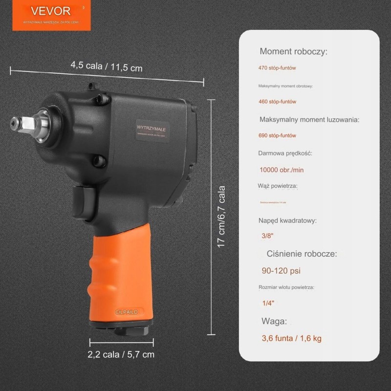 Der pneumatische 3/8-Zoll-Schlagschrauber (9,5 mm) von VEVOR ist leistungsstark genug, um Schrauben und Muttern zu lösen, und eignet sich ideal für kleine Kfz-Werkstätten oder Reparaturen und Inspektionen zu Hause; Mittlerer Luftverbrauch: 127 l/min (4,5 CFM). Luftdruck: 6,2–8,3 bar (90–120 PSI).