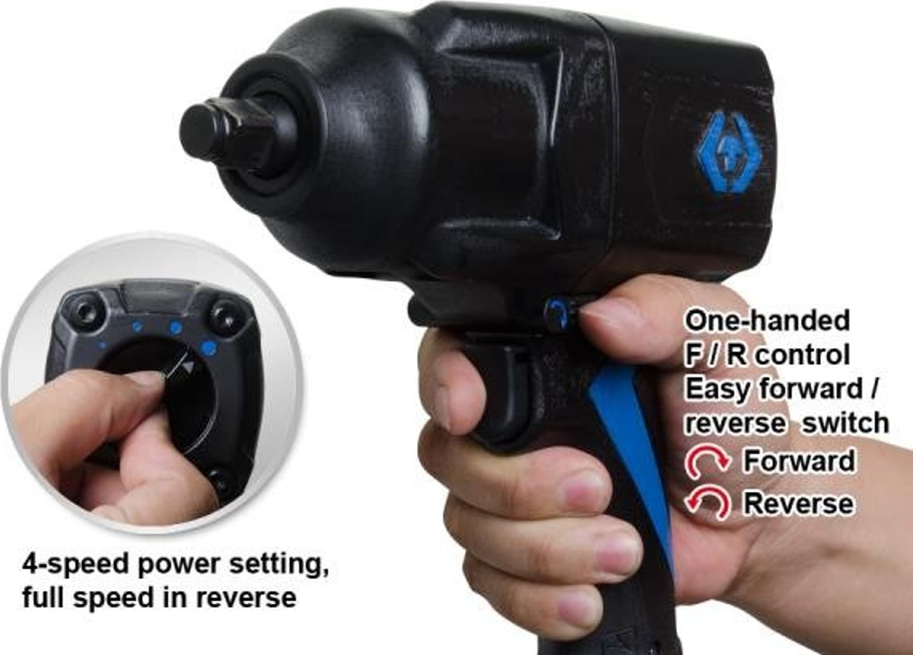 King Tony 3/4"-Komposit-Schlagschrauber. Drehzahl 8000 Umdrehungen pro Minute. Durchschnittlicher Luftverbrauch 190 l/min. Maximales Drehmoment 1491 Nm. Gewicht 2,35 kg, Länge 211 mm. Produktdatenblatt – 33681-100