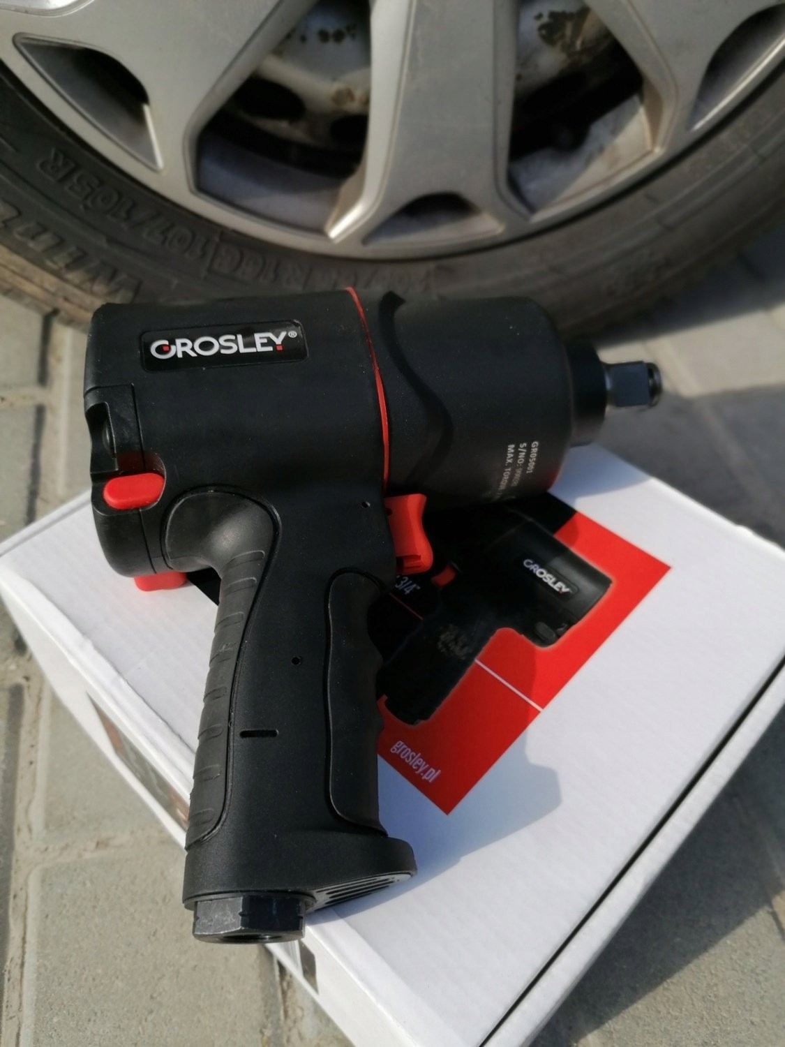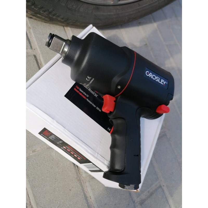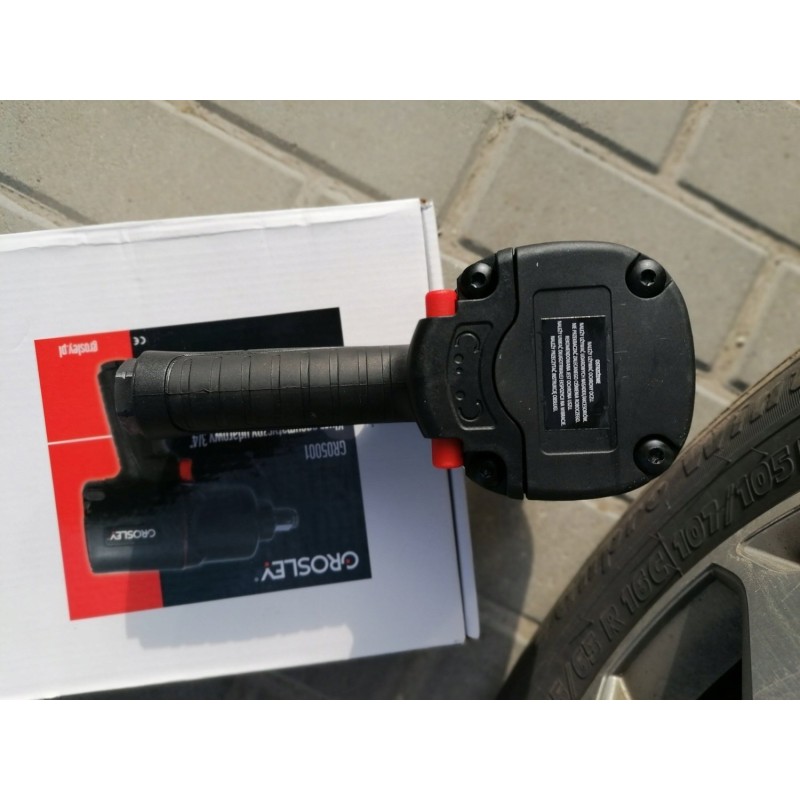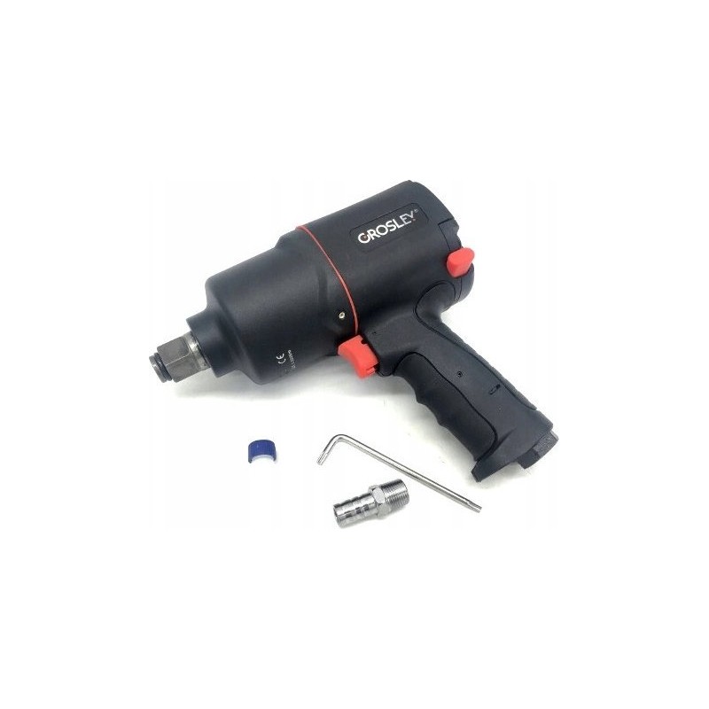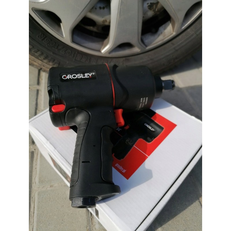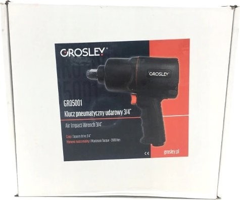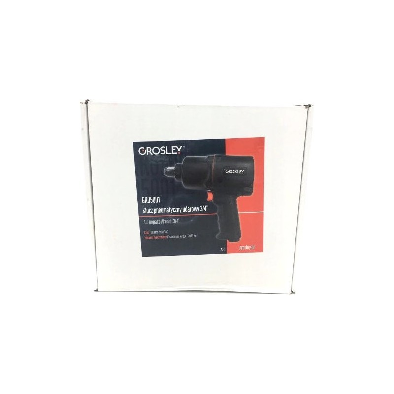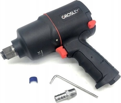 3/4"-Drucklufthammer der Marke Grosley mit einem maximalen Drehmoment von 2000 Nm. Er dient zum Lösen und Anziehen von Schrauben und Muttern. Er eignet sich für jede Kfz-Werkstatt sowie für den Einsatz in der Fertigung. Der Schlagschrauber verfügt über ein Gehäuse aus Verbundwerkstoff, wodurch er trotz seiner Abmessungen nur 3,0 kg wiegt, sowie über einen ergonomischen, rutschfesten Griff. Dies trägt wesentlich zur Effizienz und Leistungsfähigkeit des Mechanikers bei langen Arbeitszyklen bei. Das Gerät verfügt über eine Umschaltfunktion für Rechts- und Linkslauf; darüber hinaus wurde es so konzipiert, dass eine Überlastung der Gewinde der anzuziehenden Schrauben ausgeschlossen ist. Der Schlagschrauber ist für den Einsatz unter Service- und Industriebedingungen bei sehr hohen Belastungen ausgelegt. Ein großer Vorteil ist das Zwei-Schlag-System „Twin Hammer“.