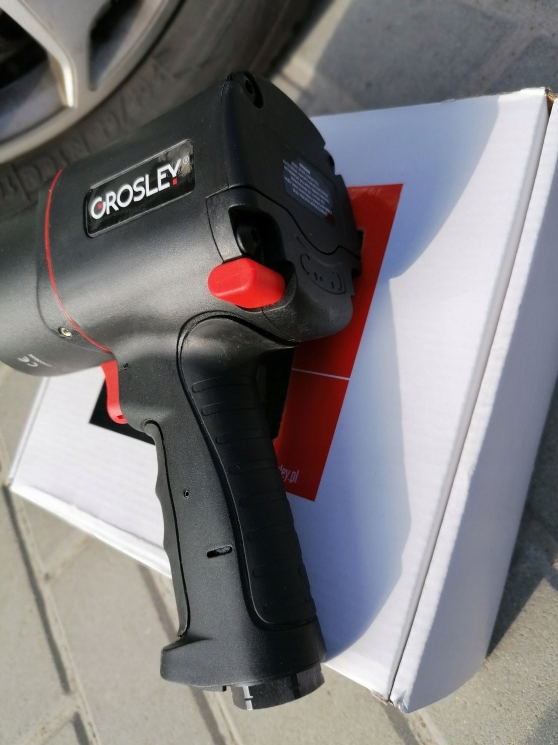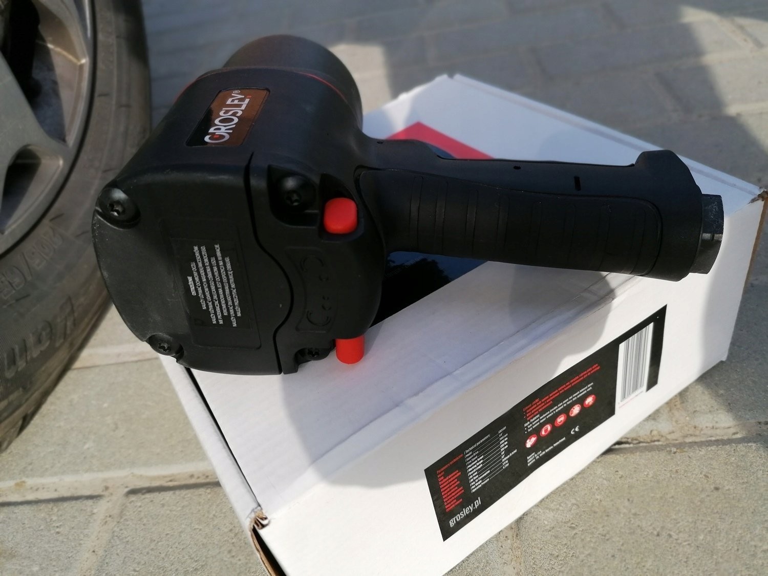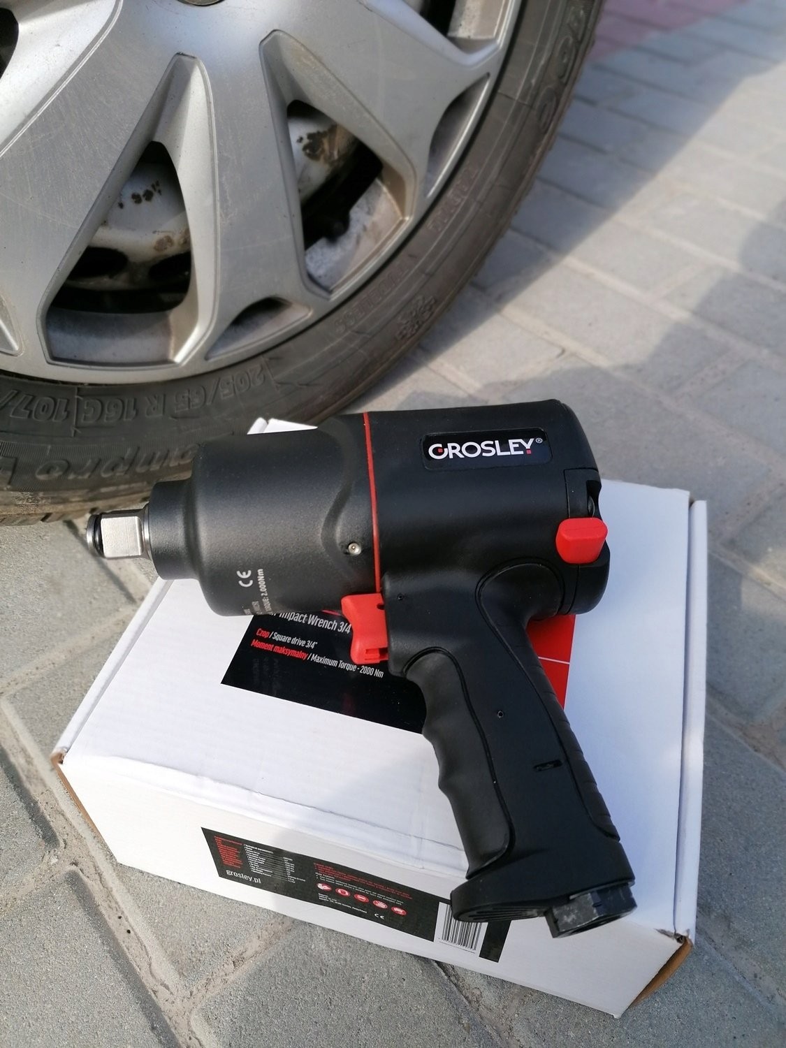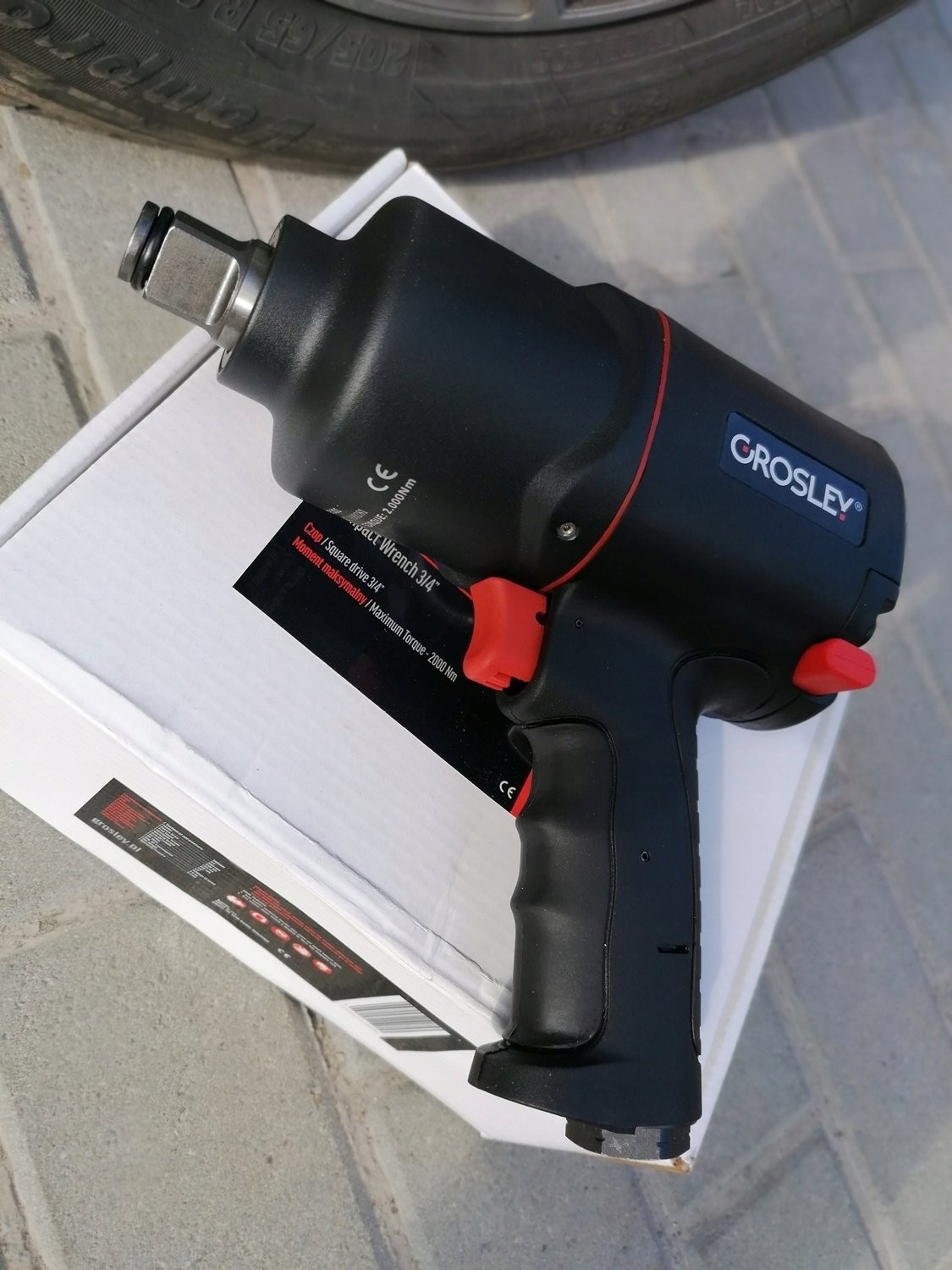 3/4"-Drucklufthammer der Marke Grosley mit einem maximalen Drehmoment von 2000 Nm. Er dient zum Lösen und Anziehen von Schrauben und Muttern. Er eignet sich für jede Kfz-Werkstatt sowie für den Einsatz in der Fertigung. Der Schlagschrauber verfügt über ein Gehäuse aus Verbundwerkstoff, wodurch er trotz seiner Abmessungen nur 3,0 kg wiegt, sowie über einen ergonomischen, rutschfesten Griff. Dies trägt wesentlich zur Effizienz und Leistungsfähigkeit des Mechanikers bei langen Arbeitszyklen bei. Das Gerät verfügt über eine Umschaltfunktion für Rechts- und Linkslauf; darüber hinaus wurde es so konzipiert, dass eine Überlastung der Gewinde der anzuziehenden Schrauben ausgeschlossen ist. Der Schlagschrauber ist für den Einsatz unter Service- und Industriebedingungen bei sehr hohen Belastungen ausgelegt. Ein großer Vorteil ist das Zwei-Schlag-System „Twin Hammer“.
