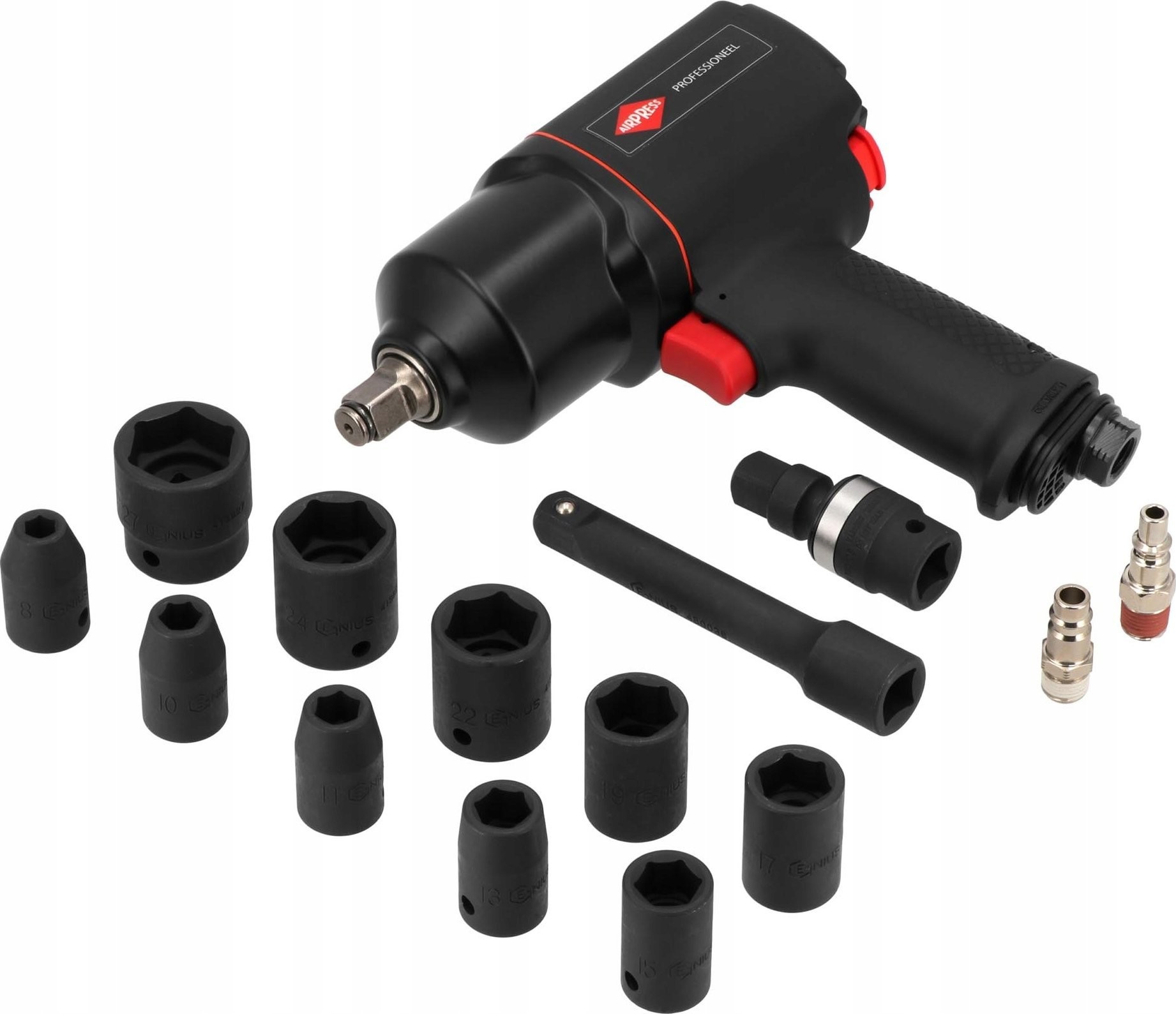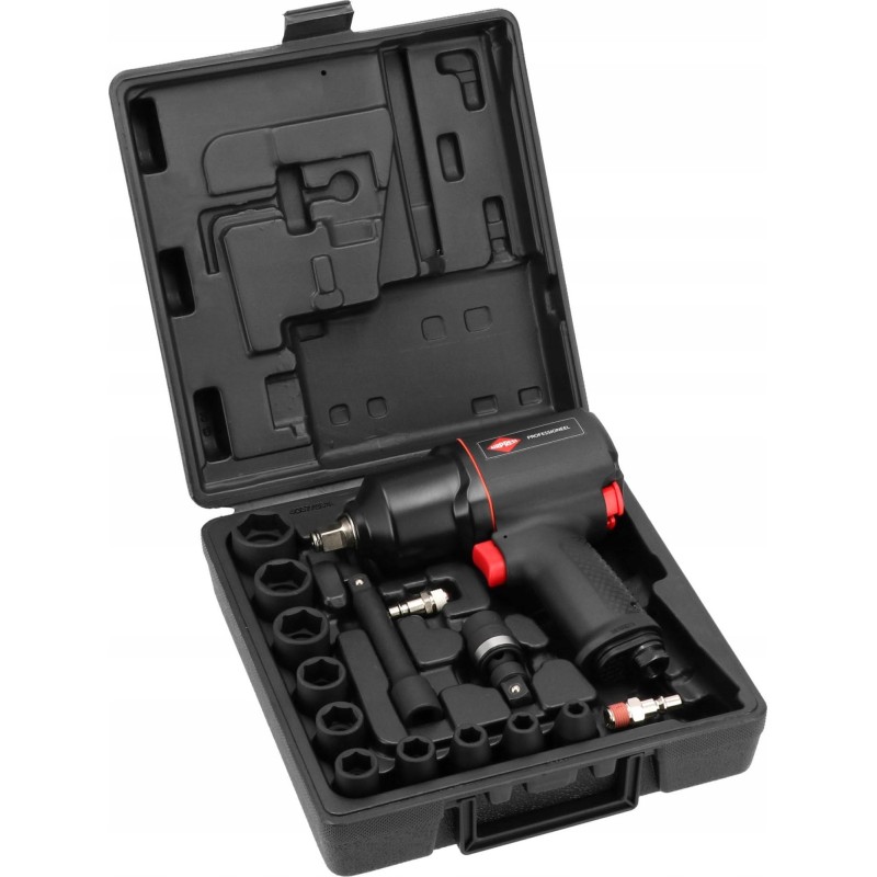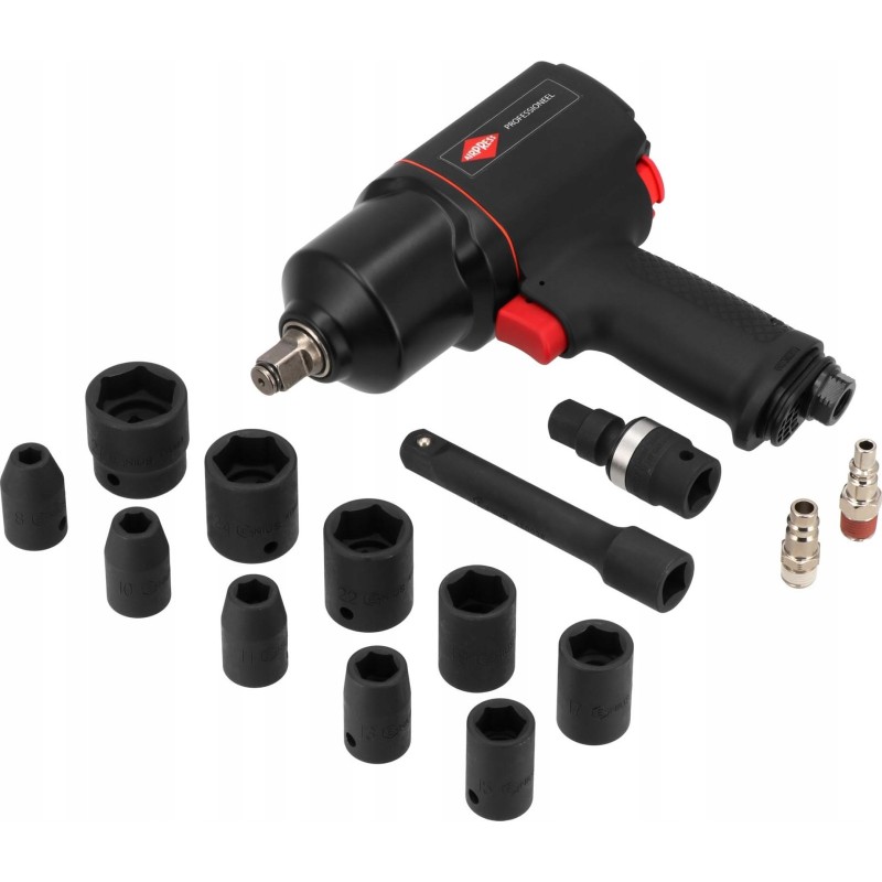 Die leistungsstarken Druckluftschrauber mit einer Leistung von 1800 Nm sind mit Aufsätzen in verschiedenen Durchmessern ausgestattet. Im Lieferumfang ist ein Adapter enthalten, mit dem der Schrauber an jeden Luftschlauchtyp angepasst werden kann. Das Set ist in einer praktischen Kunststofftasche verpackt.