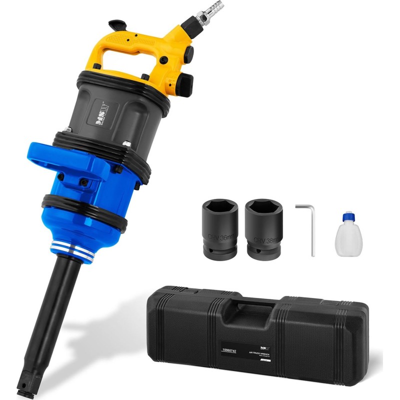 - -Set – praktischer Koffer, 1/2-Zoll-Anschluss, 2 Steckschlüsseleinsätze (36 und 38 mm), Inbusschlüssel, Befestigungsschrauben, Federscheiben und eine Flasche Öl.