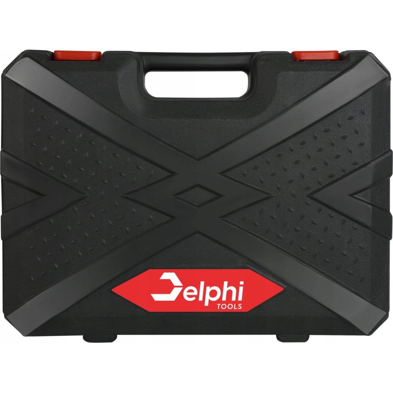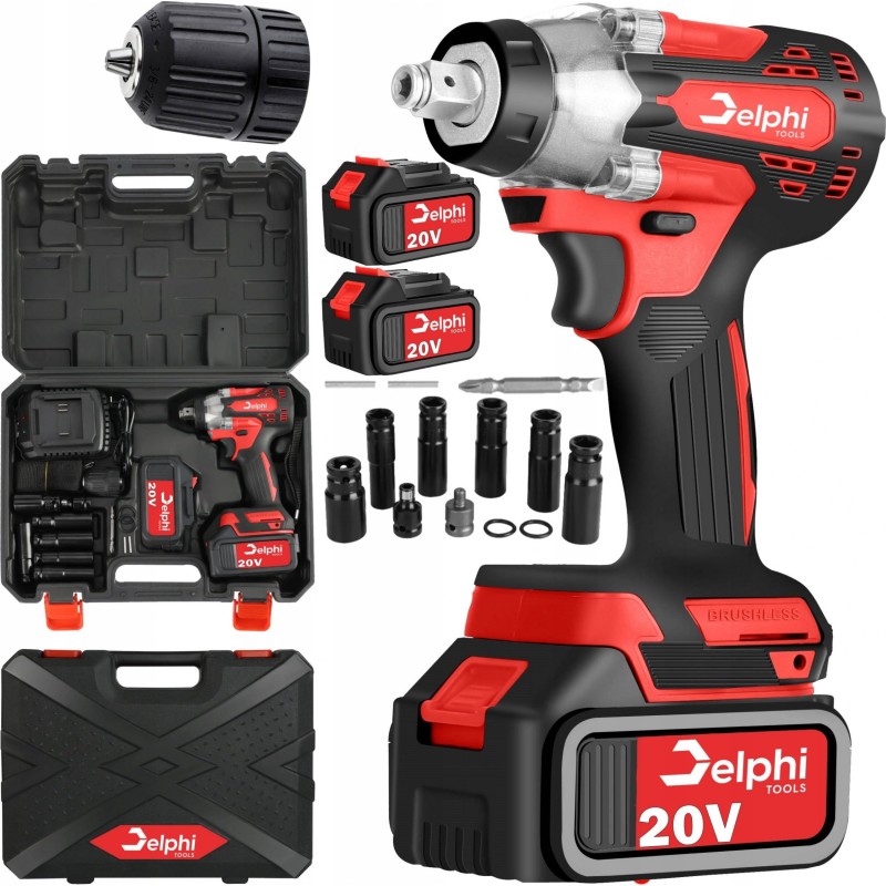 Das Set besteht aus einem Delphi-Schlagschrauber, 2 20-V-Akkus, einem Adapter für den Einsatz als normaler Schrauber, einem Satz Steckschlüssel und einem Schrauberbit – alles verpackt in einem geräumigen Koffer.
