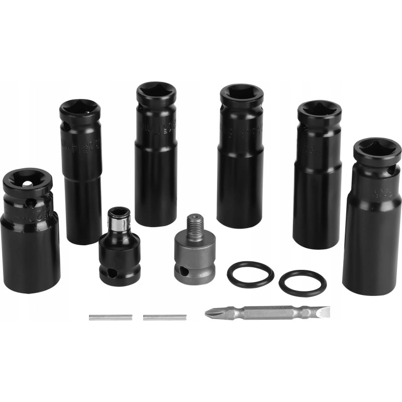 - Lange Steckschlüssel: 14, 17, 18, 19, 21, 22 mm, Adapter von 1/2" auf HEX sowie einen Bit für den Schraubendreher