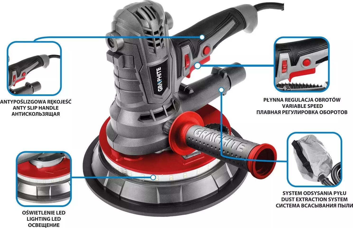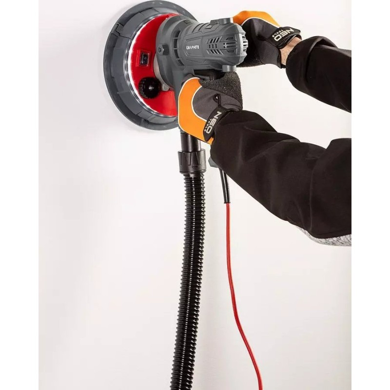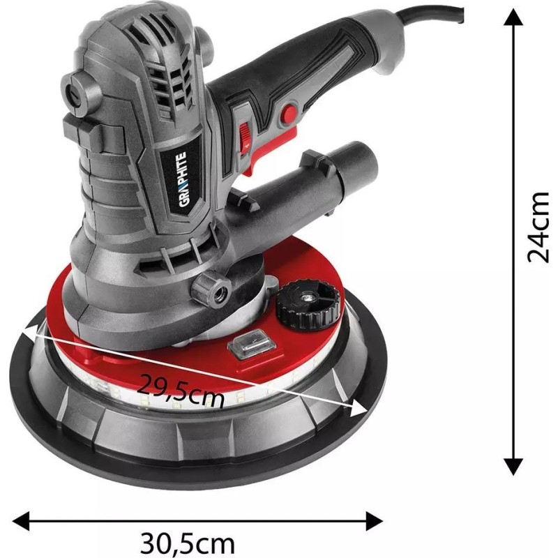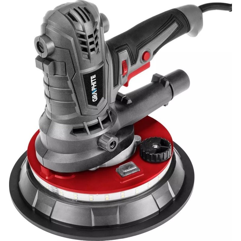 Robuste Gipsschleifmaschine der Marke GRAPHITE mit einer Leistung von 900 W. Ausgestattet mit einer Scheibe mit einem Durchmesser von 180 mm. Das Gerät arbeitet im Drehzahlbereich von 1400 bis 2700 Umdrehungen pro Minute. Es verfügt über eine stufenlose Drehzahlregelung des Schleifkopfes sowie ein Staubabsaugsystem, das für Ordnung in der Werkstatt sorgt.