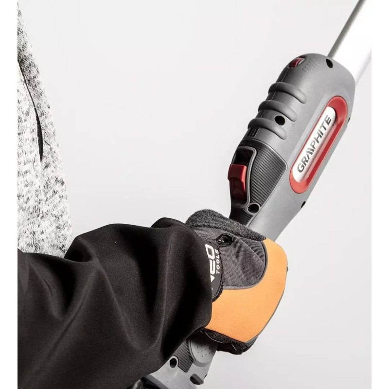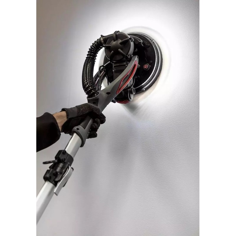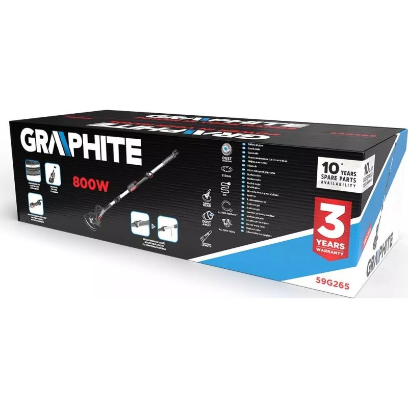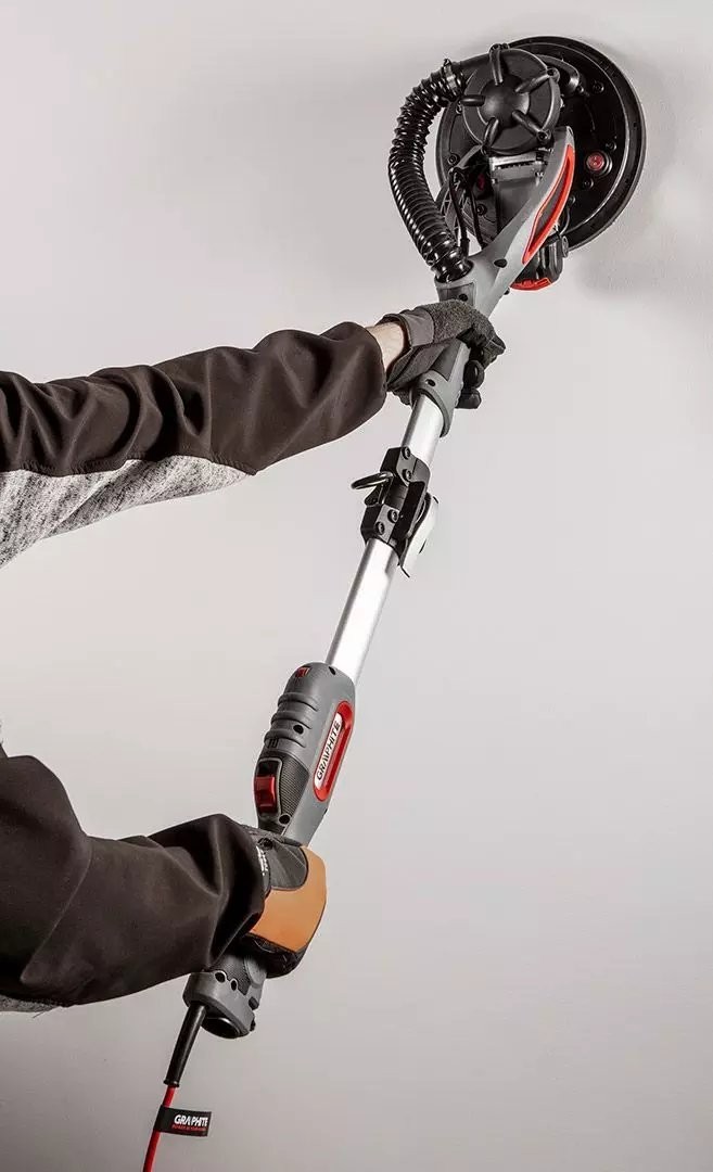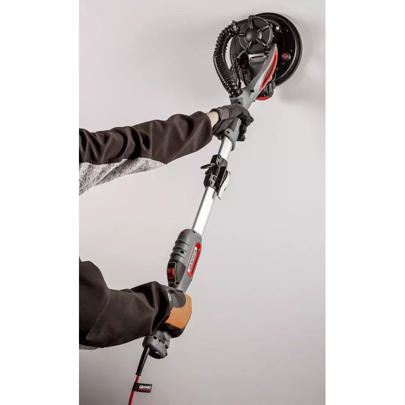 Robuste Gipsschleifmaschine der Marke GRAPHITE mit einer Leistung von 800 W und einem teleskopierbaren, ausziehbaren Handgriff. Ausgestattet mit einer Scheibe mit einem Durchmesser von 215 mm. Das Gerät arbeitet im Drehzahlbereich von 800 bis 1800 Umdrehungen pro Minute. Es verfügt über eine stufenlose Drehzahlregelung des Schleifkopfes sowie ein Staubabsaugsystem, das für Ordnung in der Werkstatt sorgt.