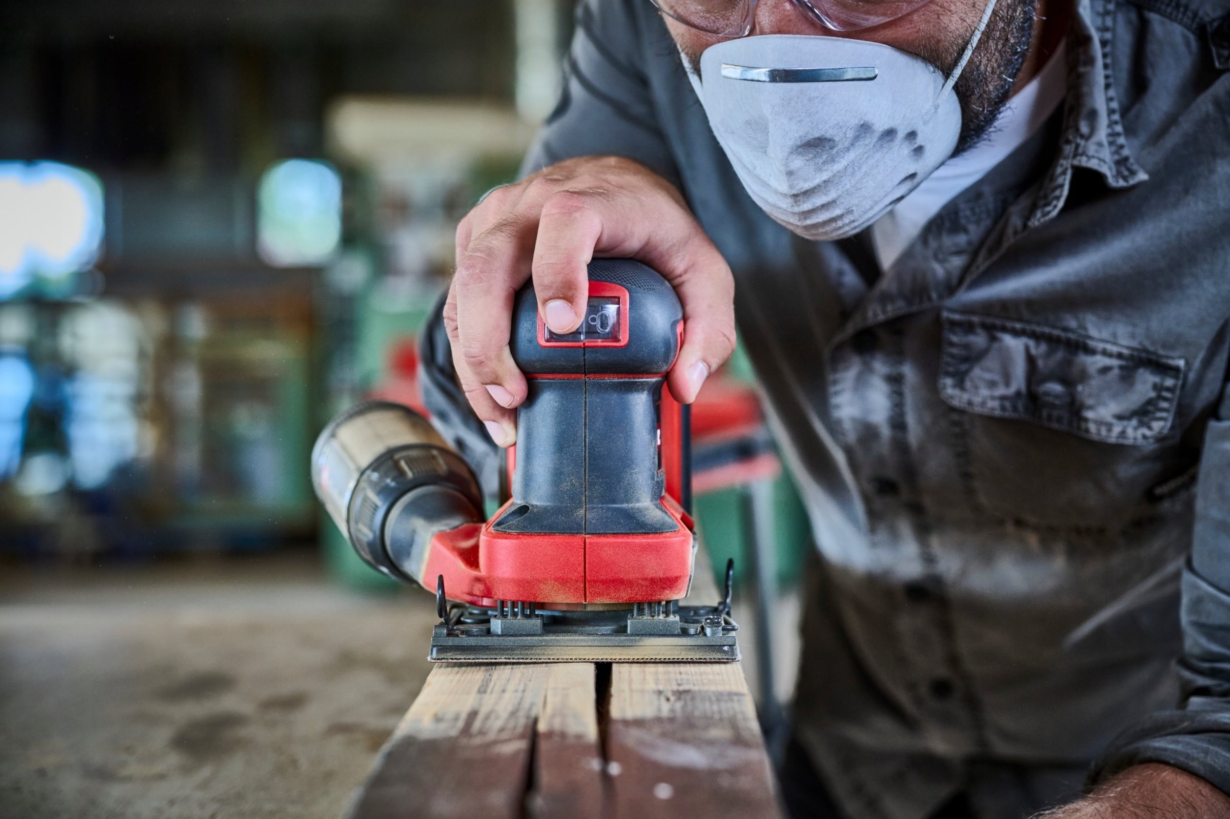 Um sauber arbeiten zu können, ist der Akku-Schleifer mit einem integrierten Staubabsaugsystem mit Staubbehälter und Faltenfilter ausgestattet. Der Filter kann herausgenommen und gereinigt werden.