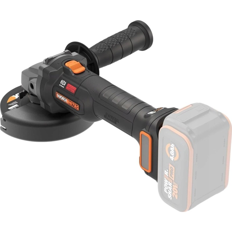 Der Worx WX814 wurde mit Blick auf den Komfort des Anwenders entwickelt. Das schlanke Gehäuse und der weiche Griff sorgen für einen sicheren Halt und verringern die Ermüdung bei längerem Arbeiten. Ein zusätzlicher, zweistufiger Seitengriff erhöht die Kontrolle über das Werkzeug bei anspruchsvolleren Aufgaben. Das elektronische Anti-Rückschlag-System schaltet das Gerät automatisch ab, wenn sich die Scheibe plötzlich blockiert, und verhindert so einen Rückschlag. Darüber hinaus lässt sich die Schutzhaube werkzeuglos verstellen, was eine schnelle Anpassung der Einstellungen während der Arbeit ermöglicht.