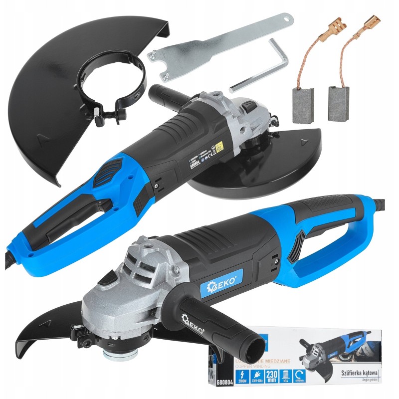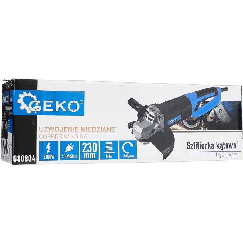 Der Winkelschleifer der Marke Geko mit einer Leistung von 2100 W und einem Scheibendurchmesser von 230 mm ist die perfekte Lösung für anspruchsvolle Anwender. Er bietet nicht nur hohe Leistung, sondern auch Arbeitskomfort, was ihn zum idealen Werkzeug für Schneid- und Schleifarbeiten unter verschiedenen Bedingungen macht.