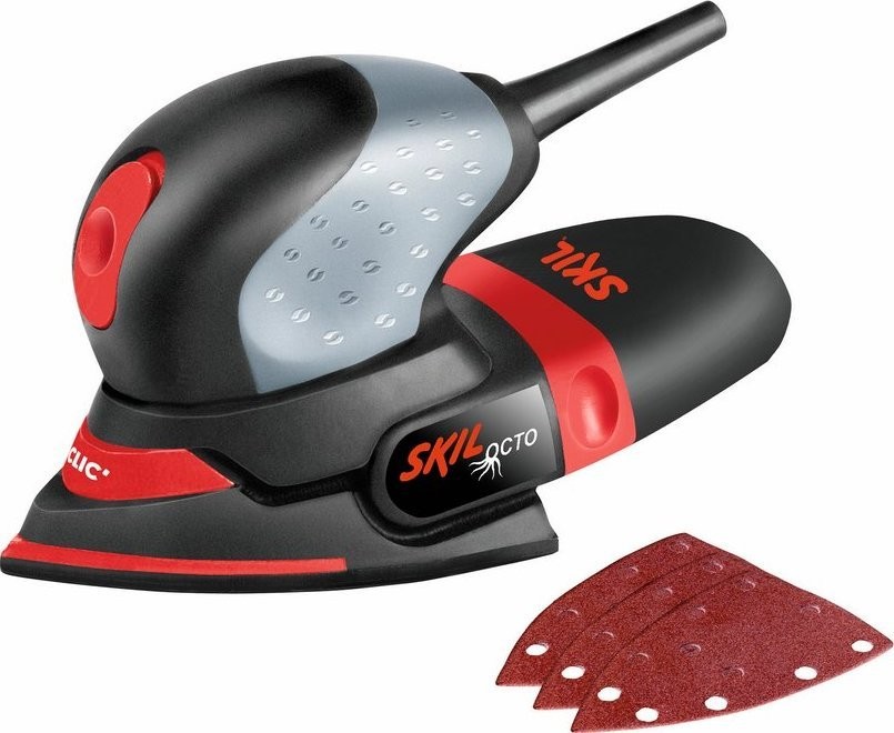 Der Multifunktionsschleifer Skil 7207 „Octo“ ist ein kompaktes, leichtes und handliches Schleifwerkzeug, das die Form eines Bügeleisens hat und somit sowohl das Schleifen großer Flächen als auch schwer zugänglicher Stellen wie Ecken und Kanten ermöglicht. Die handliche Bauweise erleichtert die Kontrolle und sorgt für komfortables Manövrieren, wodurch sich das Werkzeug ideal zum Schleifen schwer zugänglicher Stellen eignet, beispielsweise an Möbeln oder Fenstern. Der 100-W-Motor sorgt für hohe Leistung, wodurch Schleifarbeiten schnell und bequem erledigt werden können. Die drehbare Delta-Spitze des Multifunktionswerkzeugs erhöht die Lebensdauer der Schleifplatte um 300 %. Das integrierte Staubabsaugsystem mit Staubbeutel sorgt für mehr Sauberkeit am Arbeitsplatz. Im Lieferumfang der Multifunktionsschleifmaschine sind ein Staubbeutel und 3 Schleifblätter enthalten.
