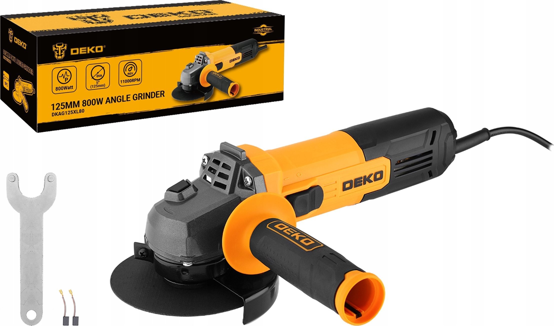 Das Set enthält alles, was Sie für den Arbeitsbeginn benötigen: den Winkelschleifer DEKO DKAG125XL80, einen Schleifscheibenschlüssel, eine Schutzhaube, einen Handgriff, Ersatzkohlebürsten sowie eine Bedienungsanleitung in polnischer Sprache. So können Sie direkt nach dem Kauf loslegen!