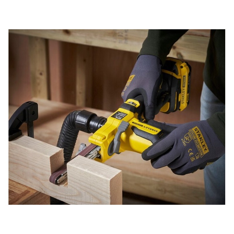 IM LIEFERUMFANG ENTHALTEN: Zwei 18-V-Akkus STANLEY FATMAX V20 2,0 Ah, 3 x Schleifbänder (13 mm x 457 mm mit Aluminiumoxidbeschichtung und Körnung 80/120/240), Offset-Arm und abnehmbarer Staubanschluss, Ladegerät und Koffer.