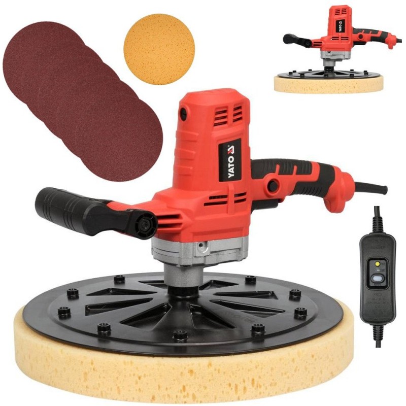 Die große Arbeitsfläche (Außendurchmesser der Scheibe 400 mm) gewährleistet ein schnelles und effektives Glätten großer Flächen. Die Möglichkeit, die Verlängerung Yato YT-82332 (separat erhältlich) zu verwenden, erhöht den Arbeitskomfort beim Glätten von Decken oder hoch gelegenen Wänden erheblich und macht den Einsatz von Gerüsten oder Leitern überflüssig. Im Lieferumfang sind austauschbare Scheiben und Schleifpapier enthalten, was einen vielseitigen Einsatz des Geräts ermöglicht, darunter das Ausgleichen von Styroporplatten bei der thermischen Sanierung sowie das Entfernen der obersten Schichten von Vinyltapeten.