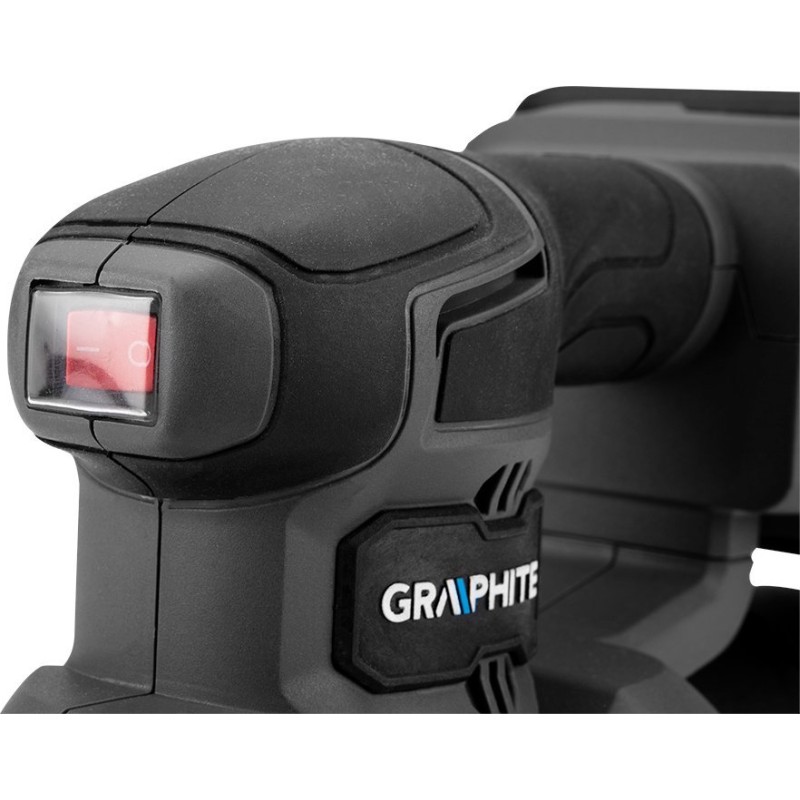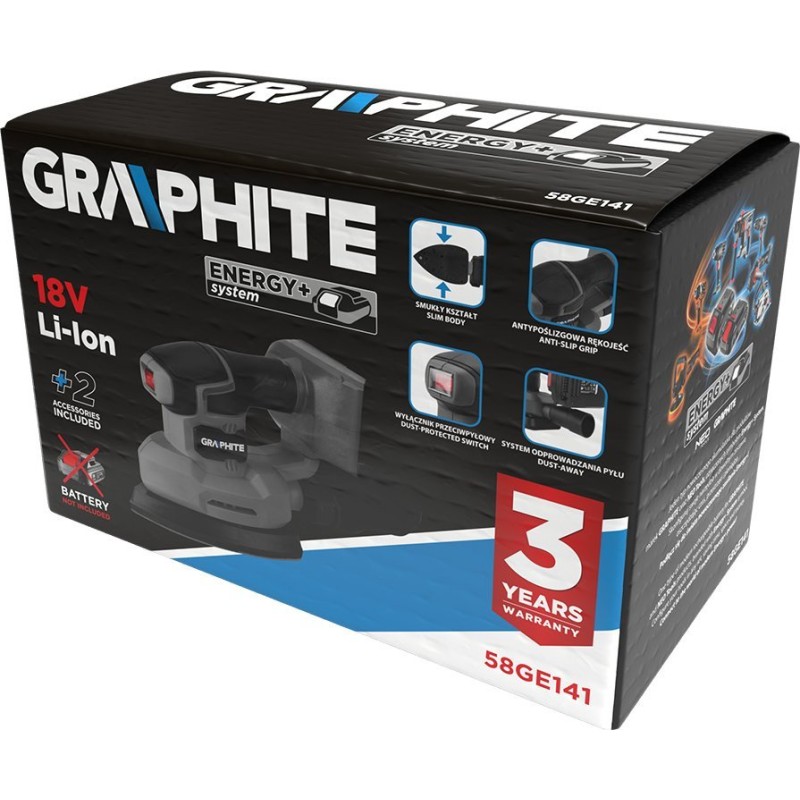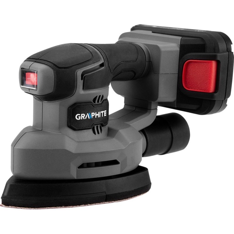 Oszillationsschleifer „DELTA“ 58GE141 GRAPHITE ENERGY+. Schleifplatte 140 x 140 x 80 mm, 13.000 U/min. Im Lieferumfang enthalten: Schleifpapier und Staubbeutel. Empfohlener Akku: 2 Ah. Laufzeit: 2 Ah 25 min, 4 Ah 48 min, 6 Ah 72 min, 8 Ah 105 min. Gewicht: 0,35 kg.