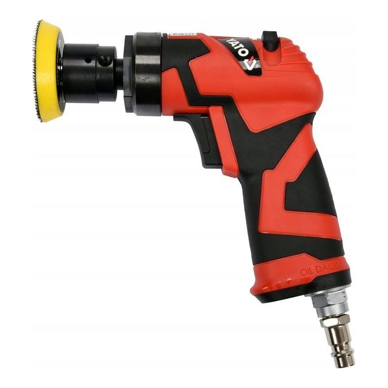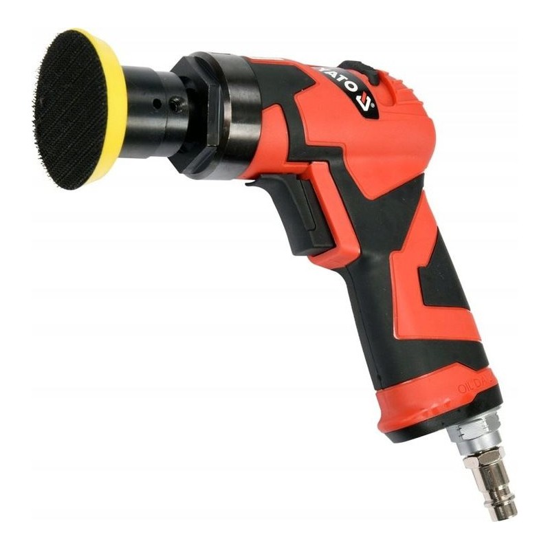 Professioneller Exzenterschleifer, der mit Druckluft betrieben wird. Dank der direkt auf die Scheiben aufgetragenen Schleifmittel ermöglicht er das Schleifen und Polieren verschiedener Materialien. Er wird in Kfz-Werkstätten und in der Industrie eingesetzt.