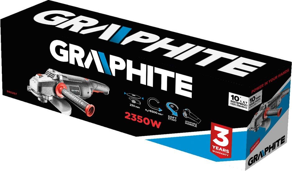 | Beschreibung: Hochwertiger Winkelschleifer GRAPHITE (Art.-Nr. 59G207) mit einem leistungsstarken 2350-W-Motor, geeignet zum Schneiden, Schleifen und Polieren von Materialien unterschiedlicher Struktur und Härte. Schleifscheibe mit einem Durchmesser von 230 mm. Dank ihrer ergonomischen Form und der präzisen Auswuchtung gewährleistet die Maschine hohen Arbeitskomfort. Der Hauptgriff mit rutschfester Auflage und der Zusatzgriff mit dreistufiger Befestigung sorgen für komfortables Arbeiten für Rechts- und Linkshänder. Aus Sicherheitsgründen ist der Schleifer mit einem Zweistufenschalter ausgestattet, der ein versehentliches Einschalten verhindert, sowie mit einem Spindelarretierungsknopf, der nicht aus dem Gehäuse herausragt. Die geeignete Anordnung der Lüftungsöffnungen schützt vor einer Überhitzung des Motors. Das Getriebegehäuse aus einer Aluminiumlegierung leitet die Wärme hervorragend ab und verstärkt zudem die Konstruktion. Die maximale Drehzahl des Schleifkopfes beträgt 6500 Umdrehungen pro Minute. Die Bürsten können von außen selbstständig ausgetauscht werden. Das Gerät ist mit einem flexiblen und robusten, 3 m langen Netzkabel mit Gummimantel ausgestattet, das auch für professionelle und industrielle Anwendungen im Innen- und Außenbereich geeignet ist. Die Konformität mit den europäischen Normen wird durch das CE-Zertifikat gewährleistet. |