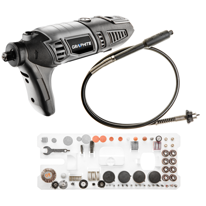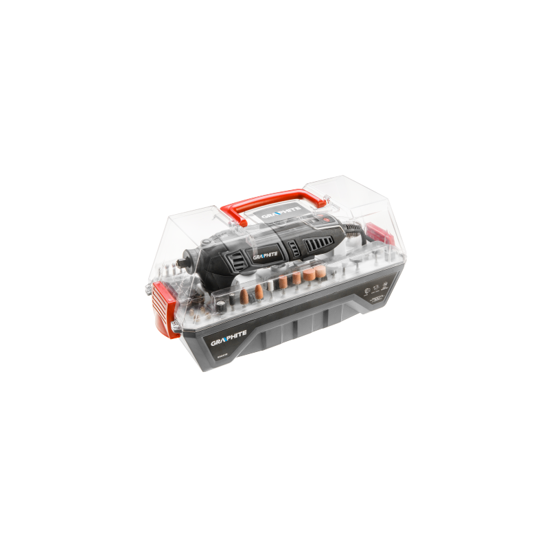 - Der Minischleifer verfügt über ein sehr umfangreiches Zubehörset, darunter Schleifsteine, Diamantfräser, Bohrer, Schleifstein, Polierfilze, Schleifkopf und Schleifbänder sowie Trennscheiben – insgesamt 190 Teile