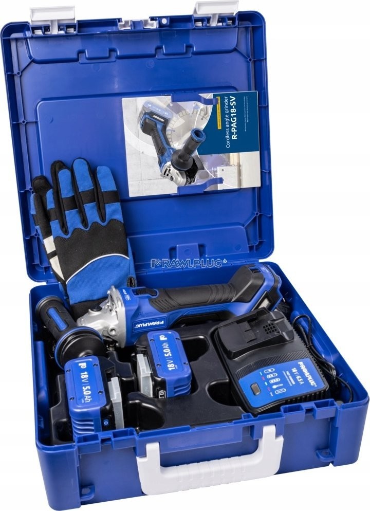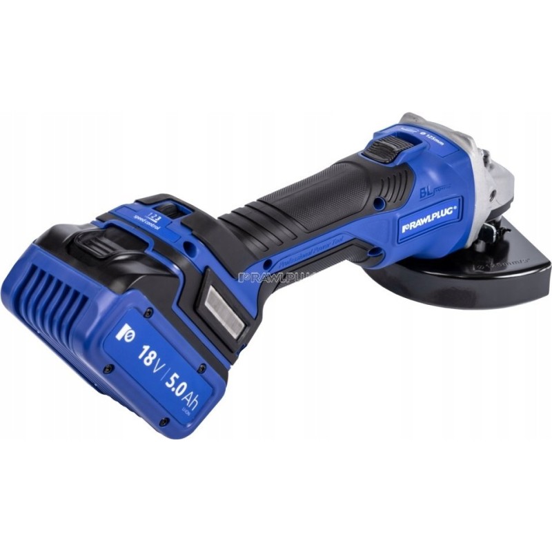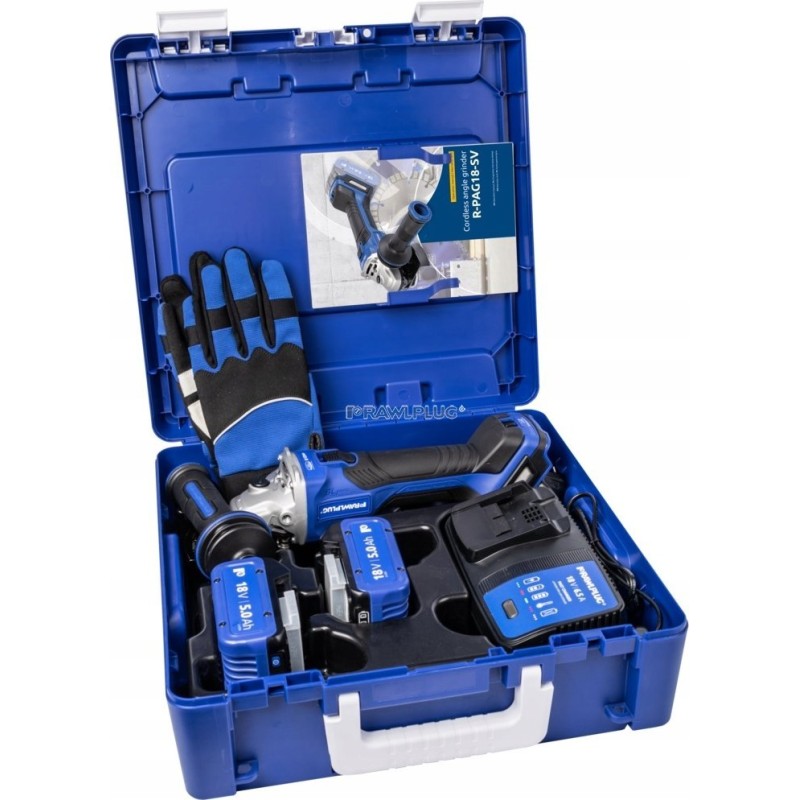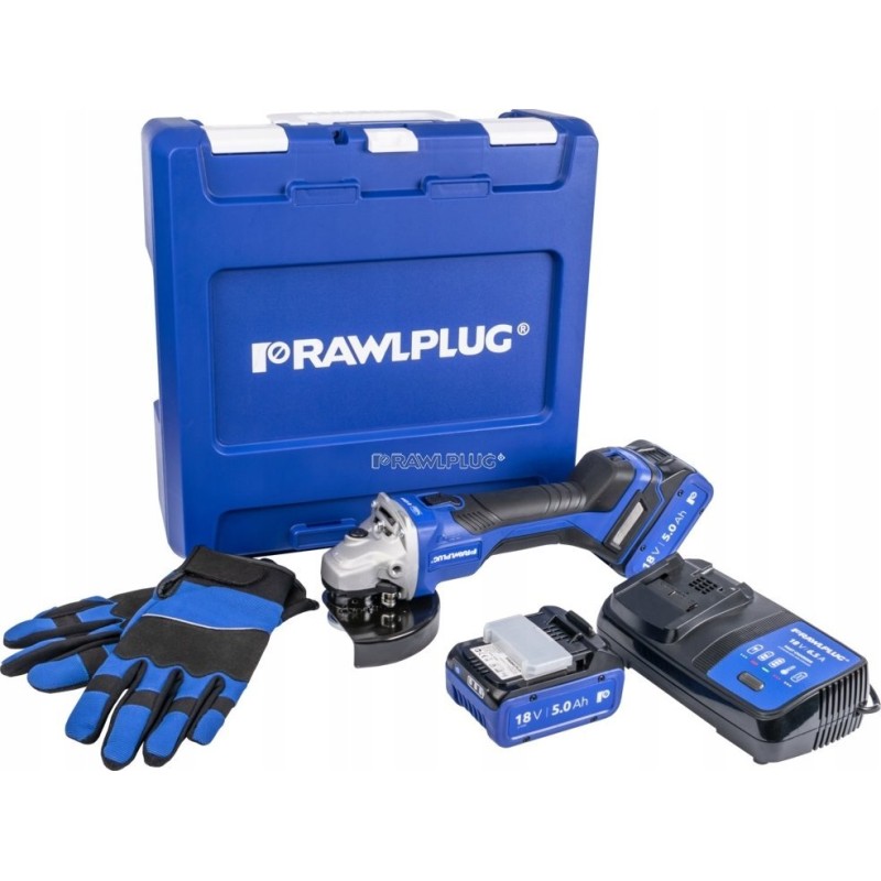18-V-Winkelschleifer, 125 mm, Drehzahlregelung, 2 Akkus à 5,0 Ah, Schnellladegerät 6,5 A, Rawlcase