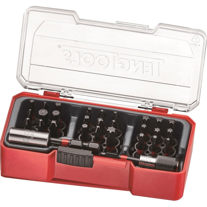 Enthält einen Impact-Bitshalter mit Magnet, einen Impact-Bitshalter mit Schnellwechselhalterung und 27 austauschbare 30-mm-Impact-Bits. Alle Bits mit 1/4"-Sechskantschaft. Speziell für Schlagschrauber angepasst. Lieferung im Kunststoffetui mit transparentem Schnappdeckel, der an einem Scharnier mit Metallachse befestigt ist. Mit Halterung zur Befestigung am Gürtel. Passt in den Behälter TTTJ04, der wiederum in die Werkzeugkisten und -wagen von Teng Tools passt.