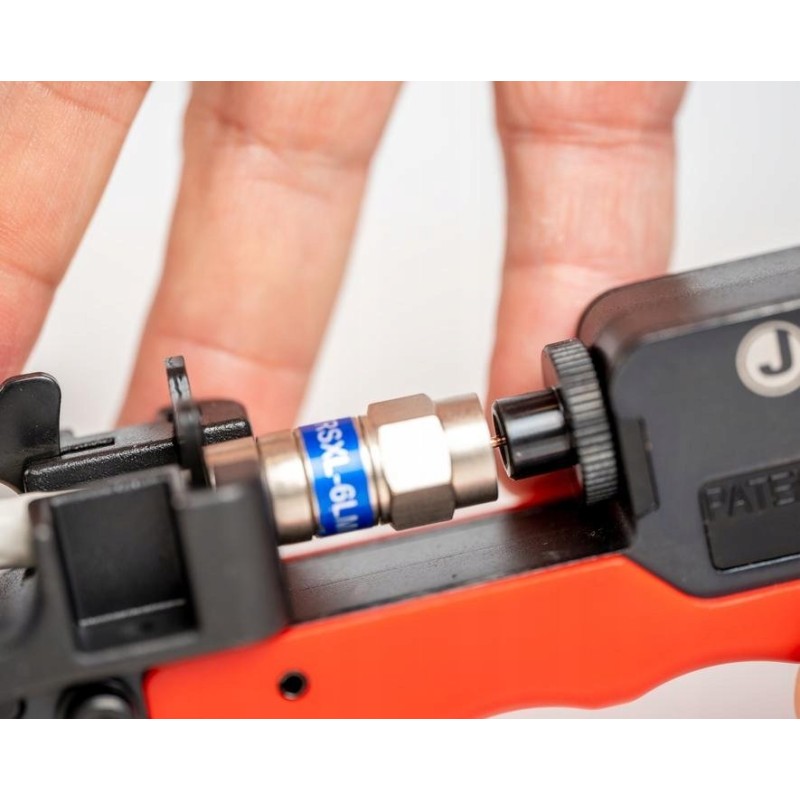 - Der PATENTIERTEN Schwenkkopf ermöglicht eine 360°-Bearbeitung von langen F-Steckern, wie sie bei RG59/6-Kabeln verwendet werden, sowie von F-Steckern für RG7/11-Kabel