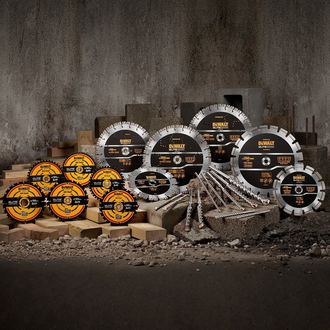 Die Diamantscheiben der DeWALT ELITE SERIES wurden im Hinblick auf Langlebigkeit und Schneidleistung bei harten Baumaterialien (Beton, Stahlbeton, Stein, Granit) entwickelt. Dank der Verwendung von lasergeschweißten Segmenten mit einer höheren Diamantanzahl und einem stärkeren Bindemittel bieten diese Scheiben eine bis zu 5-mal längere Lebensdauer beim Schneiden von harten Materialien im Vergleich zu Scheiben, die speziell für C35-Beton ausgelegt sind. Die patentierte Pfeilschneidkonstruktion ermöglicht schnelles Schneiden in hartem Beton und sorgt für hochwertige, gerade und tiefe Schnitte. Die mit Hartmetall verstärkte Matrix erhöht die Diamantbindungskraft, was zu einer noch höheren Leistung führt. Der aus hochlegiertem Stahl gefertigte Scheibenkern ermöglicht gerade und tiefe Schnitte.