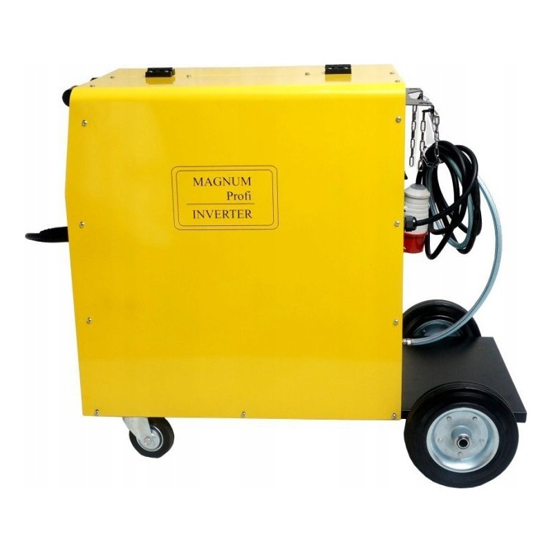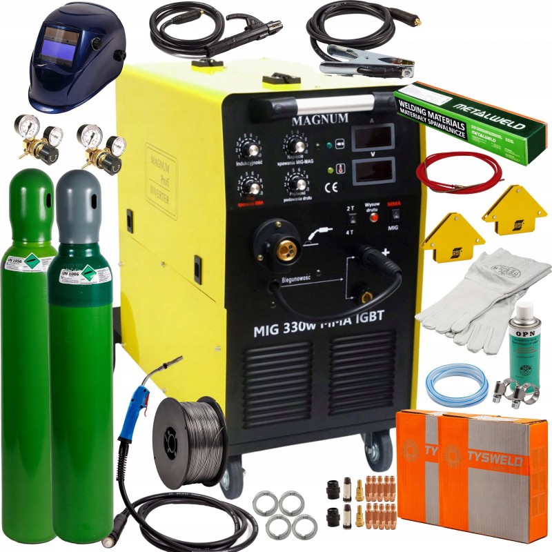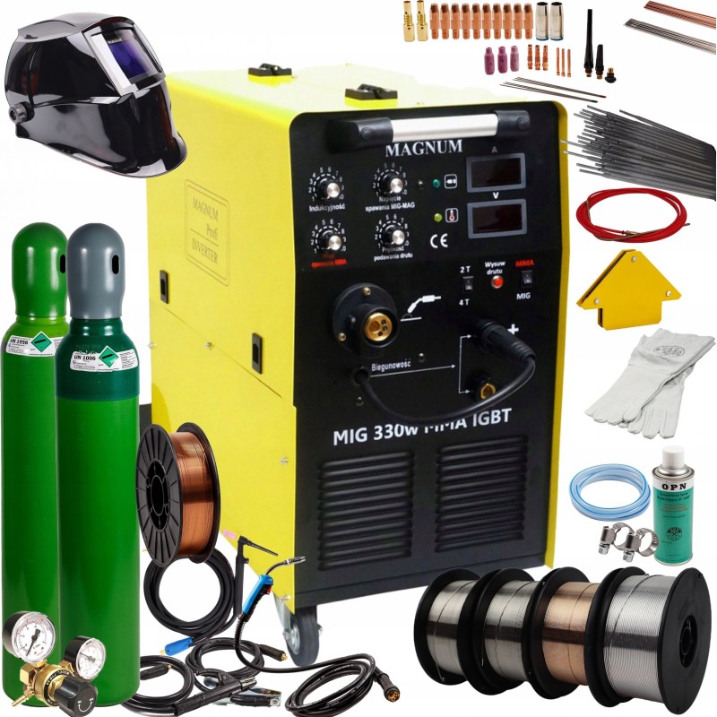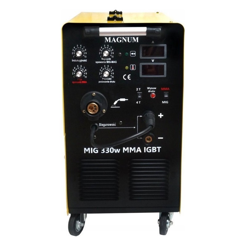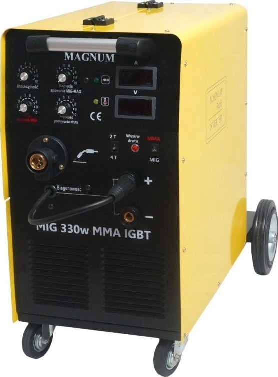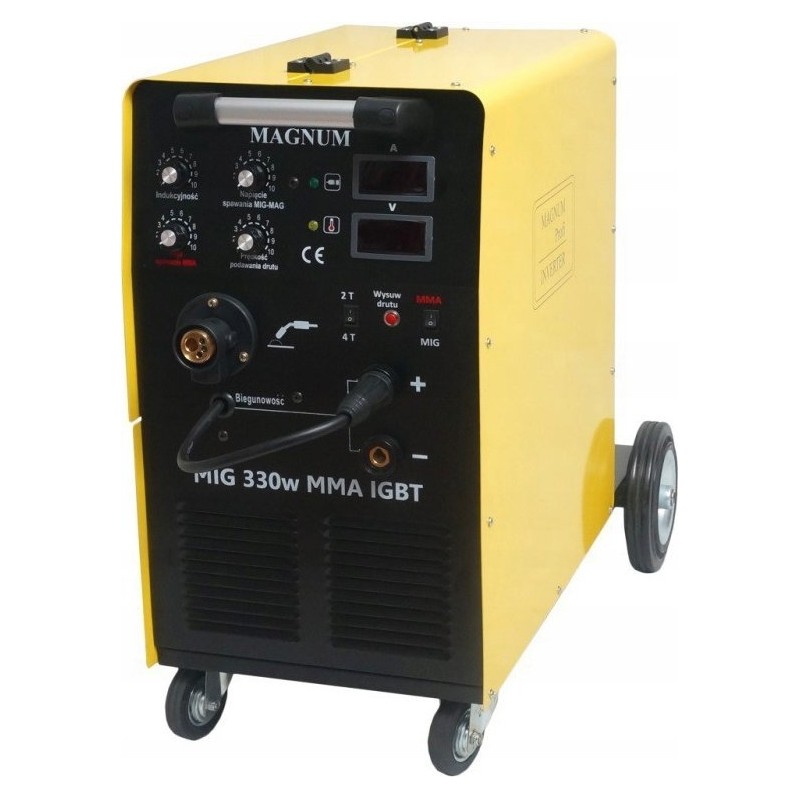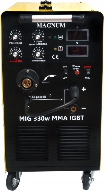 Das Gerät MAGNUM MIG 330w MMA IGBT ist ein professionelles halbautomatisches Schweißgerät, das über ein dreiphasiges 400-V-Netz mit einer maximalen Schweißstromstärke von 330 A betrieben wird. Das Gerät ermöglicht das Lichtbogenschweißen mit schmelzendem MIG/MAG-Elektrodendraht, selbstschützendem FCAW-Draht (die Polarität am Schweißgerät muss geändert werden: Minus (-) am Schweißbrenner, Plus (+) an der Masse!) sowie das MMA-Schweißen mit ummantelten Elektroden (Rutil-, basische, saure).