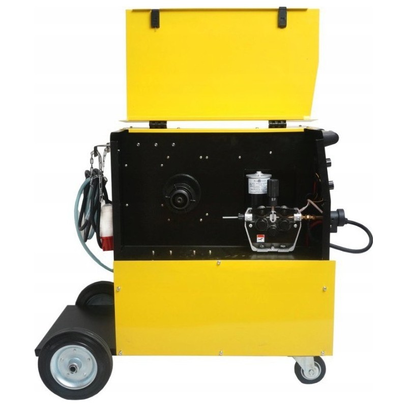 Die Stromquelle wurde auf Basis der neuesten Technologie unter Verwendung von IGBT-Transistoren entwickelt, was zu einer Verringerung elektromagnetischer Störungen, geringen Leistungsverlusten, einer Steigerung der Effizienz und Zuverlässigkeit der Stromquelle sowie zu einer deutlichen Senkung des Energieverbrauchs führt. Das Gerät verfügt über eine stufenlose Regelung der Schweißparameter und ist mit einer thermischen Überlastsicherung ausgestattet, die eine übermäßige Überhitzung verhindert. Das Schweißgerät ist mit einer 2T/4T-Funktion, einem professionellen 4-Rollen-Drahtvorschub mit „Euro-Stecker“-Anschluss ausgestattet, der den Anschluss verschiedener Schweißzangen sowie einen Ausgang für einen Gasvorwärmer ermöglicht.