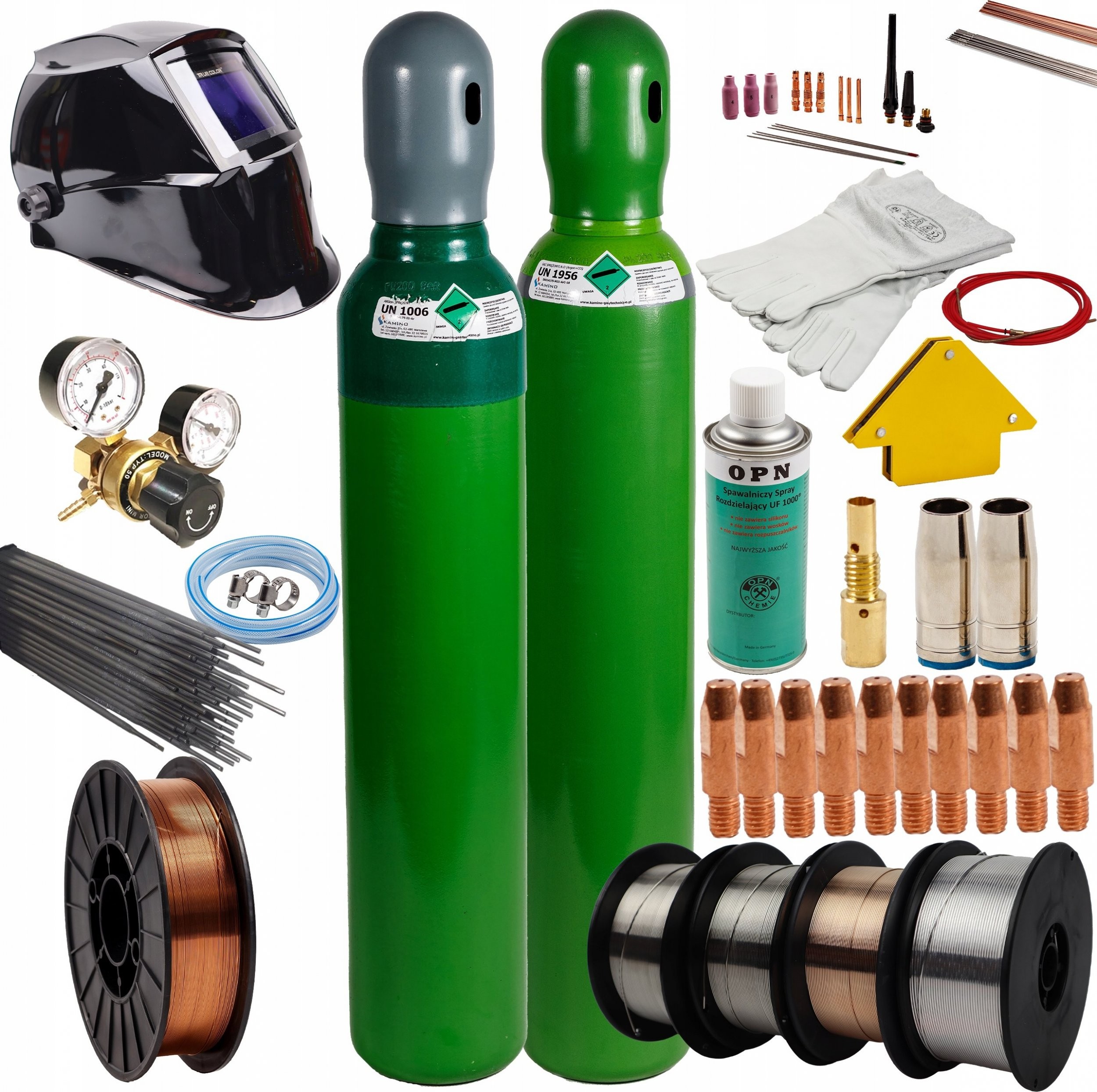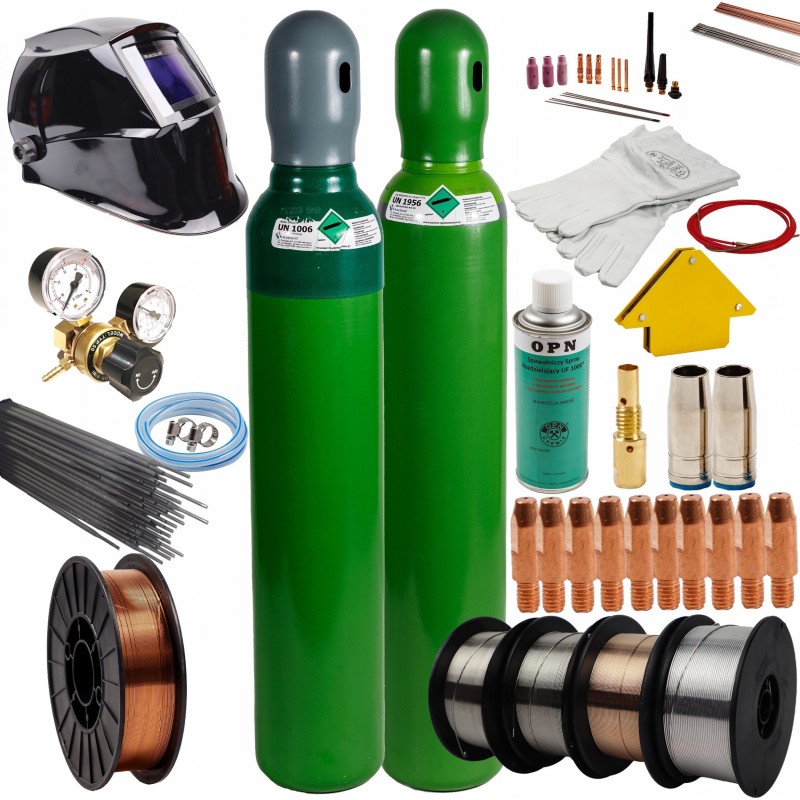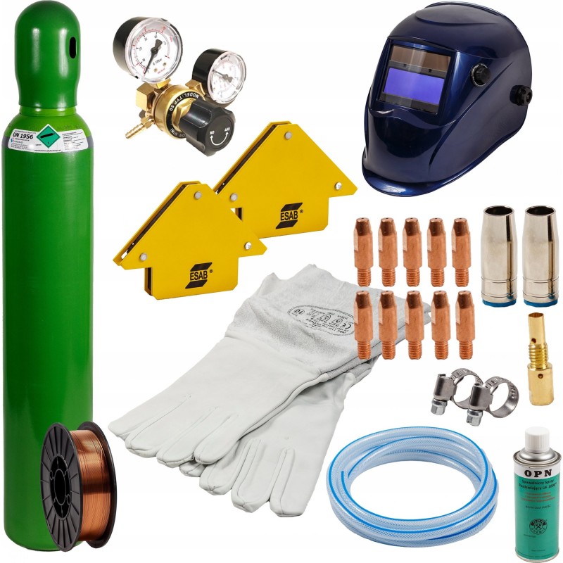 - Neue 8-Liter-Flasche, gefüllt mit MIX ARG/CO₂ oder CO₂, mit einer 10-Jahres-Eichung und einer Schutzkappe für den Transport (die Flaschen können an jeder Tankstelle für technische Gase befüllt werden)
