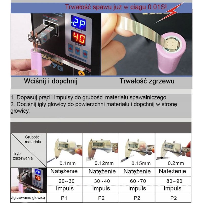 Das Schweißmodul verfügt über zwei Betriebsmodi, und die fest am Gehäuse des Geräts angebrachten Elektroden (Stromeinstellung 0 ~ 99) ermöglichen das Schweißen von Nickelstreifen mit einer Dicke von 0,03 ~ 0,2 mm (0,15 mm bei reinem Nickel).