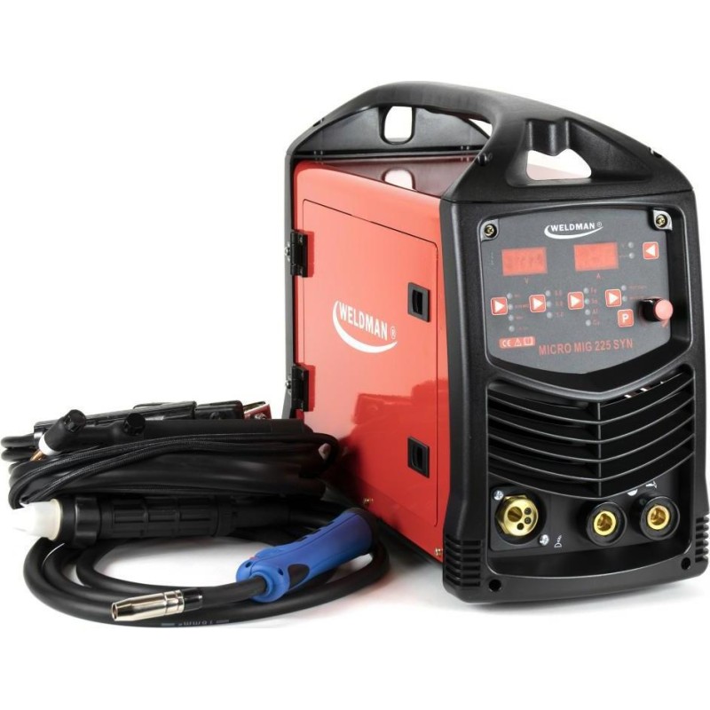 Das Gerät Weldman Micro MIG 225 Synergy wird mit Einphasenstrom betrieben und ist mikroprozessorgesteuert.