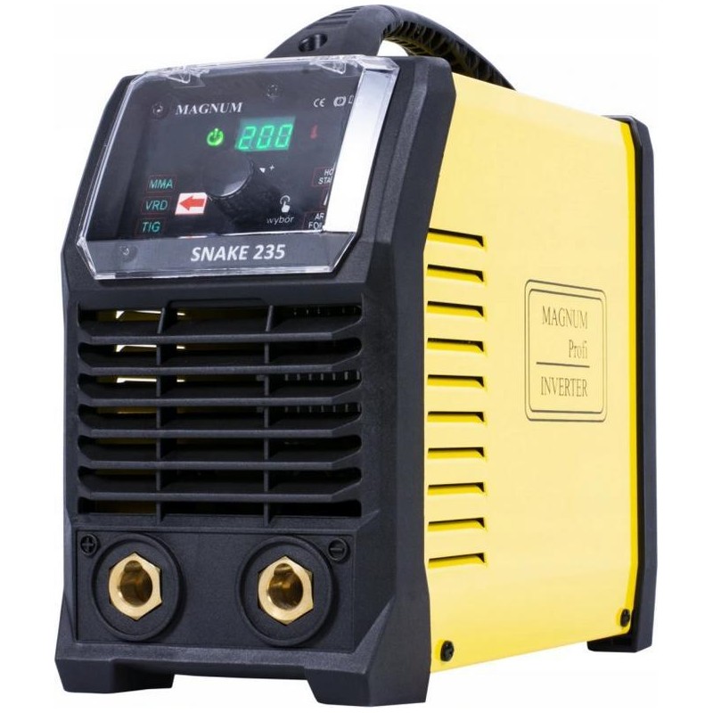 Das Invertergerät SNAKE 235 der Marke MAGNUM ist eine leichte, tragbare Stromquelle. Es dient zum Schweißen mit ummantelten Elektroden verschiedener Arten von unlegiertem, niedriglegiertem, hochlegiertem, rostfreiem und hitzebeständigem Stahl sowie von Kupfer und Gusseisen. Das Gerät zeichnet sich durch einen hohen Wirkungsgrad von 200 A/60 % sowie hervorragende Lichtbogencharakteristiken für Rutil- und basische Elektroden aus.