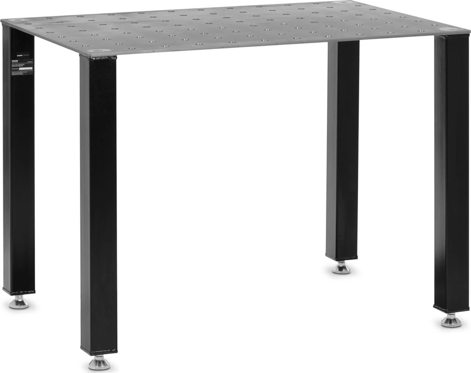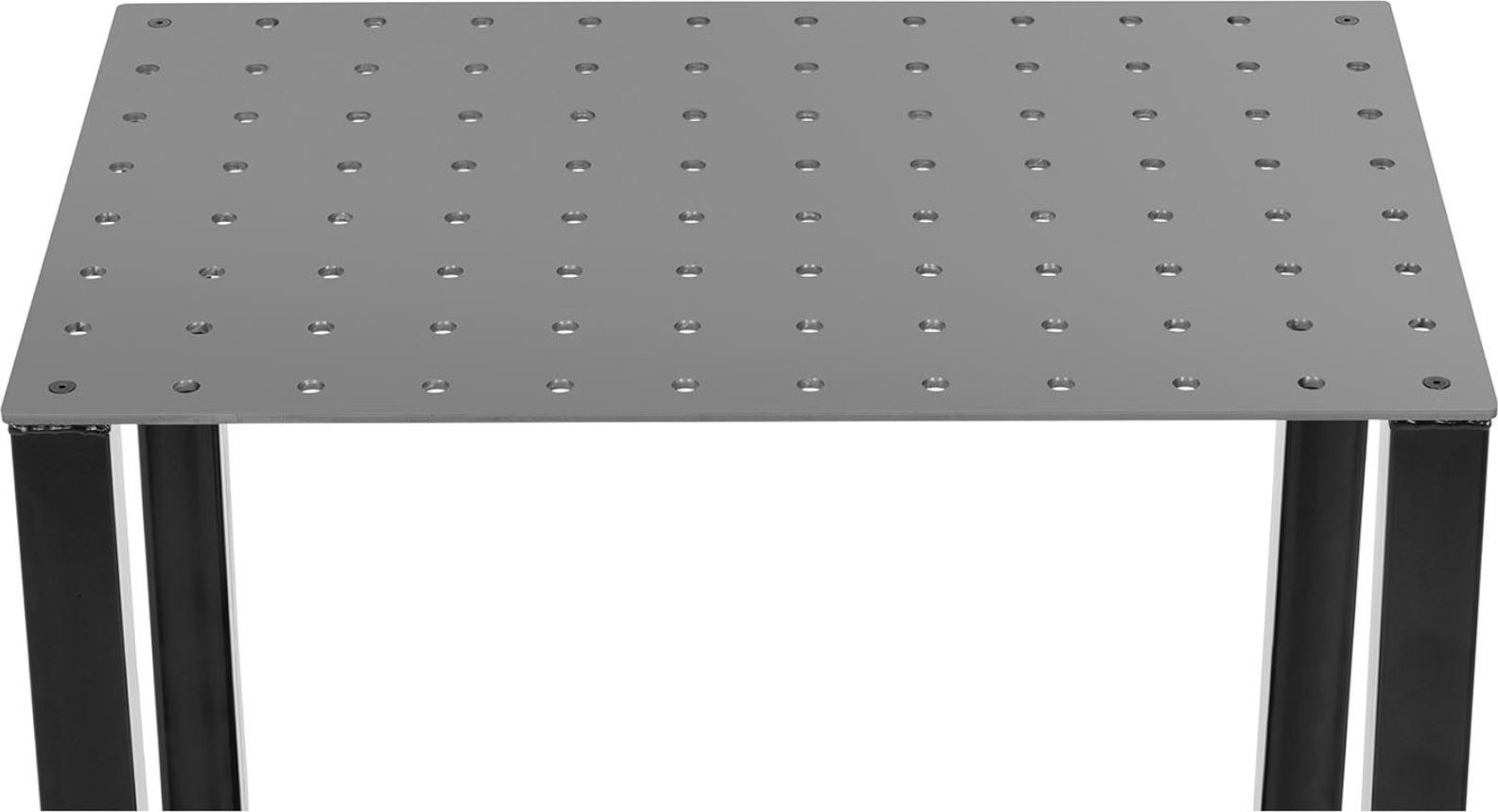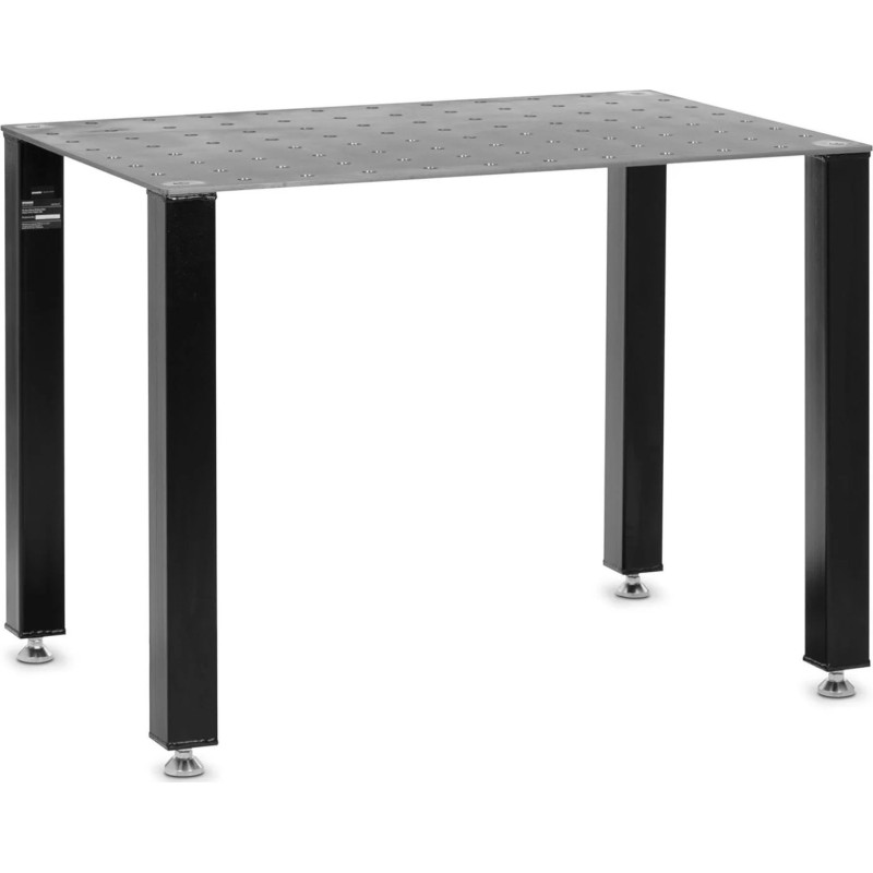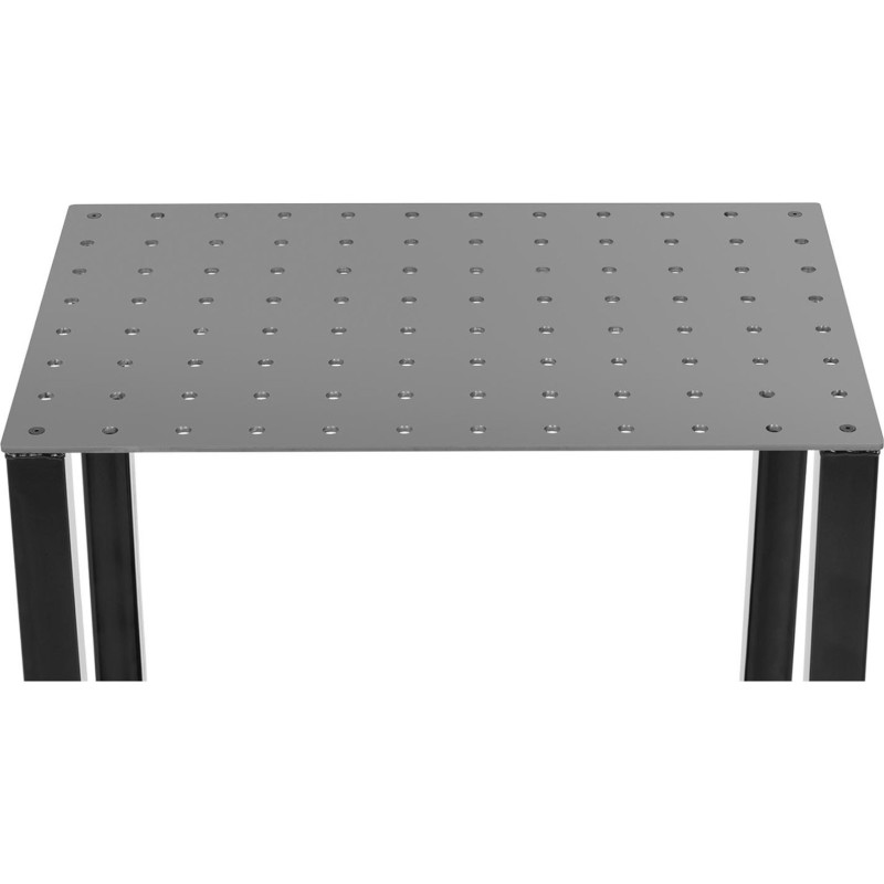 ermöglicht es, Werkstücke auf Arbeitshöhe anzuheben. Die stabile Konstruktion trägt selbst schwere Metallteile. Die Tischplatte bietet viel Platz, um diese bequem abzulegen und bei Bedarf ein Schweißgerät darauf zu platzieren. Die gelochte Stahlplatte ruht auf vier stabilen Beinen mit den Maßen 80 x 80 mm.