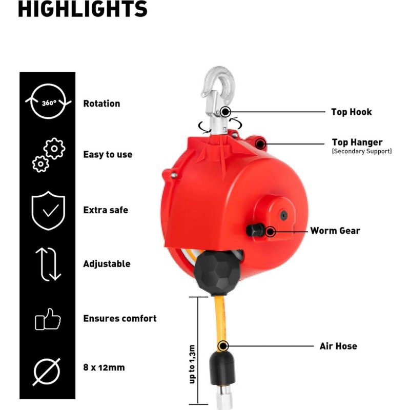 . Der Balancer muss immer senkrecht betrieben werden, um das Gewicht optimal auszugleichen. Der Schlauch ist 1,3 m