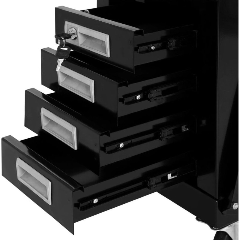 Der robuste und solide Schweißwagen ist aus hochwertigem Stahl gefertigt. Er hält einer Belastung von bis zu 70 kg stand. Dank der eingebauten Rollen lässt er sich leichtgängig bewegen und ist einfach zu transportieren. Er ist mit 4 Schubladen ausgestattet, die viel Platz für die Organisation und Aufbewahrung von Schweißwerkzeugen bieten. Alle 4 Schubladen lassen sich gleichzeitig mit einem integrierten Schloss verschließen, das ein versehentliches Herausgleiten der Schubladen beim Transport des Wagens verhindert.