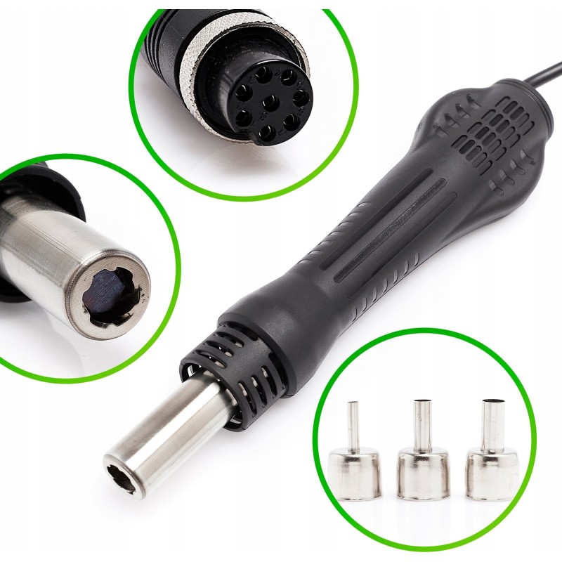 ✅ Heißluftlötkolben (Hotair) mit einer Leistung von 700 W. Das Gerät zeichnet sich durch ein kompaktes Gehäuse aus, das wenig Platz beansprucht. Die Station verfügt über eine einstellbare Temperatur von 100 °C bis 500 °C sowie eine einstellbare Gebläseleistung.