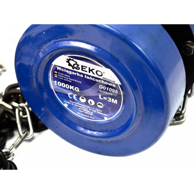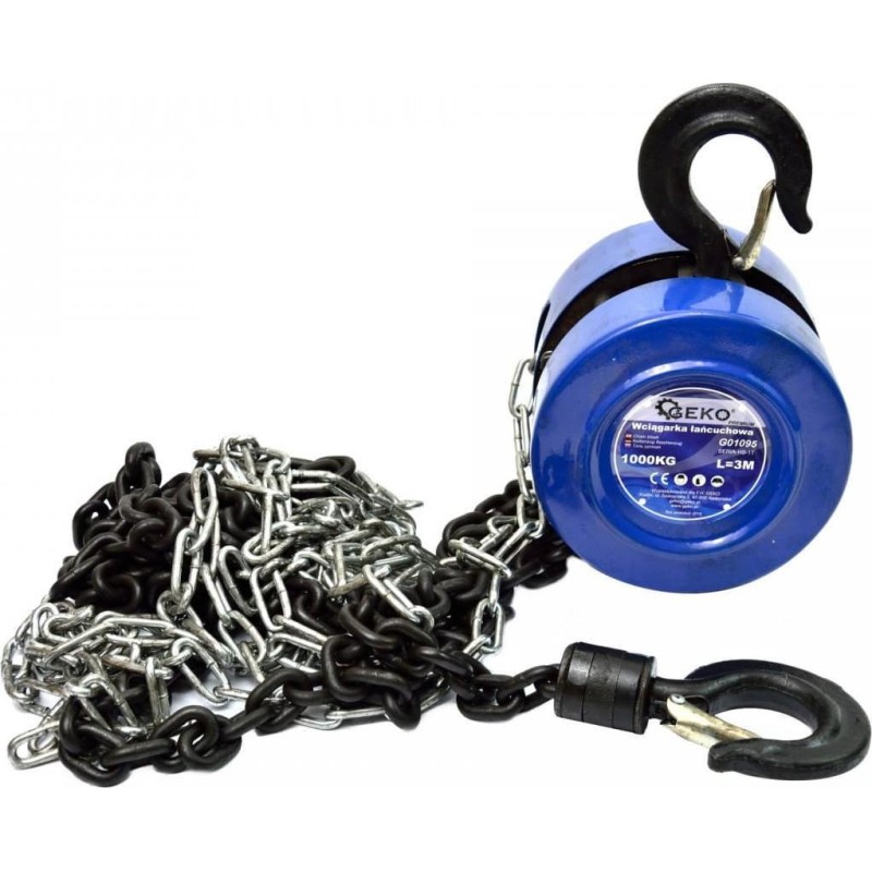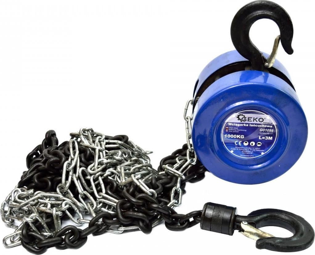 Kettenzug 1000 kg 3 m GEKO PREMIUM Leistungsstarker und robuster Kettenzug. Die Kettenwinde ist ein Gerät zum Heben schwerer Gegenstände in vertikaler Ebene. Sie findet beispielsweise beim Ausbau von Verbrennungsmotoren aus PKWs und anderen Fahrzeugen Anwendung. Produkteigenschaften: sicher in der Handhabung und wartungsfreundlich; Tragkraft: 1000 kg; Kettenlänge: 3 m; Drahtdurchmesser der Kettenglieder: 6 mm; Haken aus gehärtetem Stahl; Stahlkette; hohe Leistung und Belastbarkeit; leicht und einfach zu transportieren; CE-Zertifikat