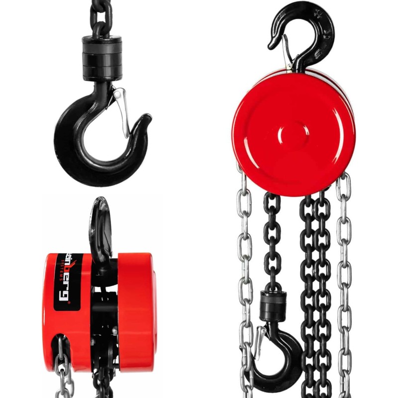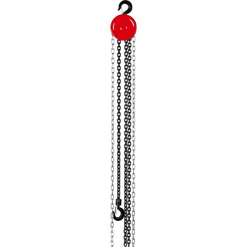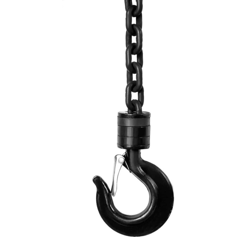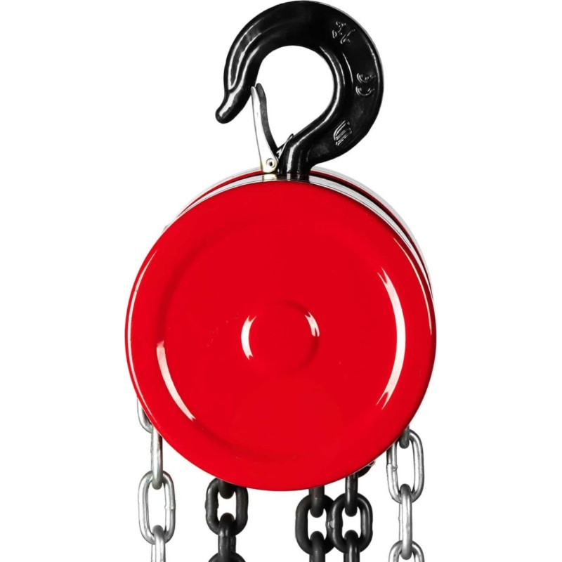 kann das Gerät auch an Orten ohne Stromanschluss eingesetzt werden. Dank des integrierten Hakens kann das Gerät an der Decke aufgehängt werden. Das Gehäuse des Hebezeugs besteht aus kohlenstoffarmem Stahl, die Kette aus gehärtetem Stahl und der Haken am Ende aus Kohlenstoffstahl. Außerdem wurden elektrolytisch verzinkte Schrauben und Muttern verwendet.