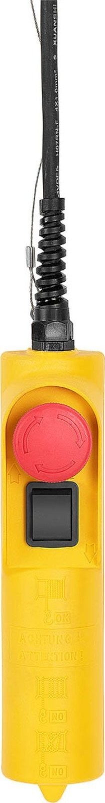 . Das robuste Stahlseil ist gegen Verdrehen gesichert und verschleißfest. Durch den Einsatz eines Flaschenzugs verringert sich die Hubhöhe um die Hälfte auf 6 m und die Hubgeschwindigkeit halbiert sich auf 4 m/min. Gleichzeitig erhöht sich die Tragkraft der Winde auf 300 kg und ermöglicht das Heben schwerer Lasten. Die Zugkraft ist doppelt so hoch, wenn eine Seilrolle verwendet wird. Die Winde wird über eine kabelgebundene Fernbedienung