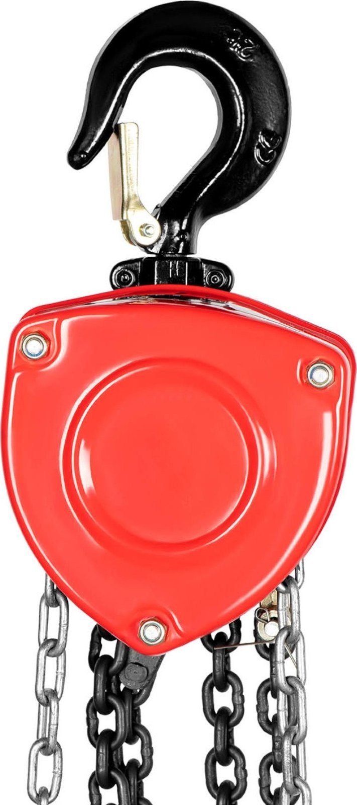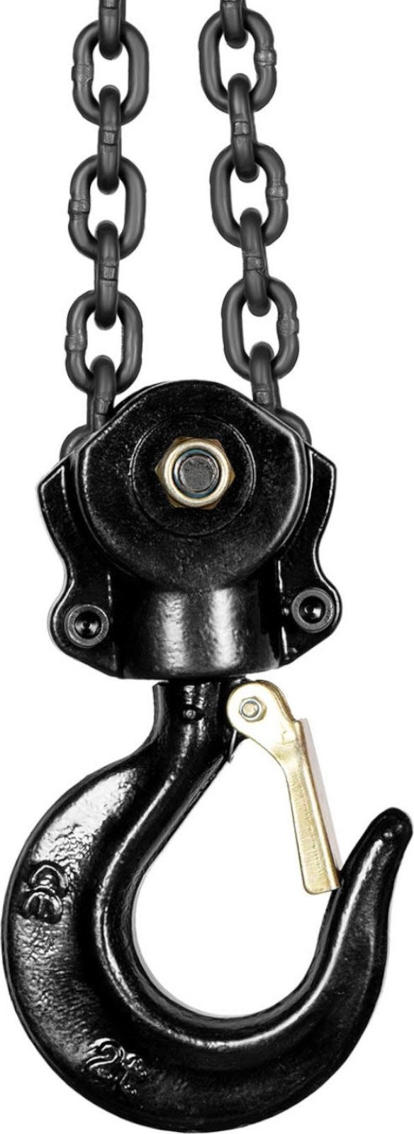 bedient. Die robuste Konstruktion gewährleistet Sicherheit bei der Arbeit. Das Gehäuse besteht aus kohlenstoffarmem Stahl, die Kette aus gehärtetem Stahl und der Haken aus Kohlenstoffstahl. Außerdem wurden elektrolytisch verzinkte Schrauben und Muttern verwendet.